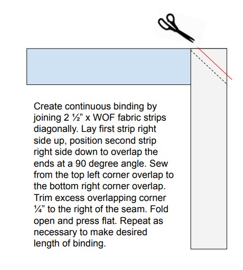 - Prepare the binding by cutting 2 1/2” in by WOF strips of fabric and attach all strips together by stitching diagonally together. Press strips wrong sides together in half lengthwise along the entire length of the binding to complete. (See diagram of this process below)