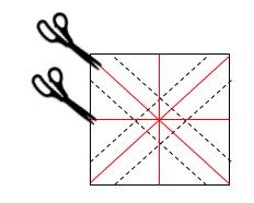 - Cut the square apart along each diagonal line, as well as on the horizontal and vertical axes. See Figure 2.