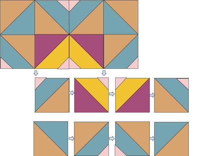 - Begin by sewing all blocks by rows as shown, RST. Press seams flat or to darker sides of the fabric upon completing the row.