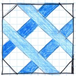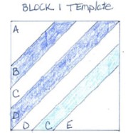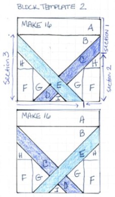- Repeat Steps 1 through 11, but reverse the sides on which the light blue and dark blue strips are sewn. See Block 2 Template. Make 16 blocks like this.