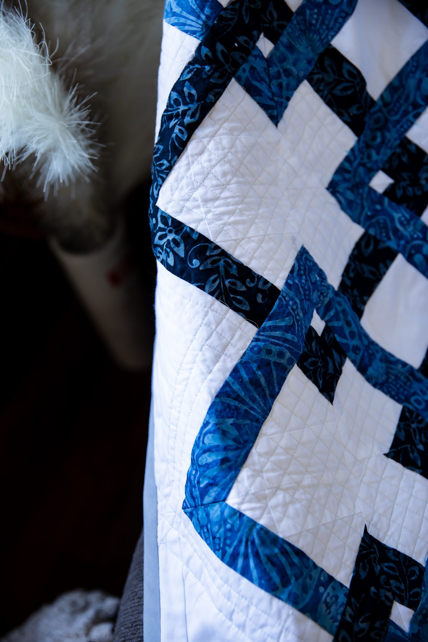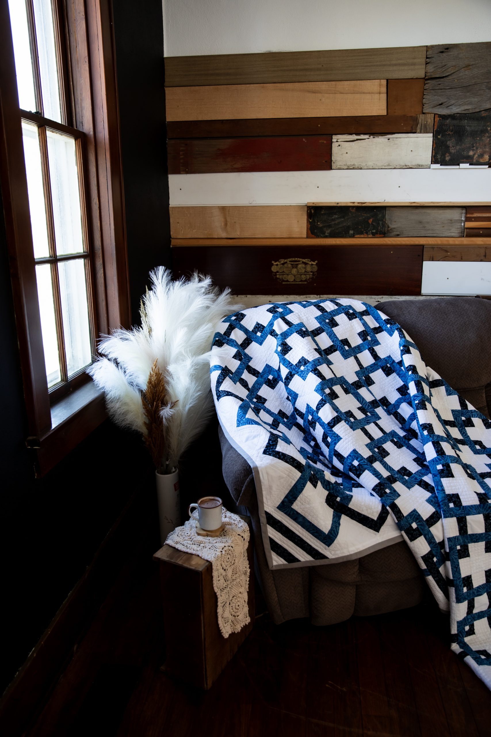 Is there anything cozier than settling down in your quilt studio on a snowy afternoon? If you’ve been searching for the perfect quilt to work on this month, don’t miss this stunning winter quilt pattern from Debi Schmitz. Made in rich blue batiks against a stark white background, this lattice quilt pattern measures at 72 inches by 108 inches and features a lovely design of interlocked blocks. Give your living space a snug, warm feeling by adding this beautiful lattice quilt to your winter décor.