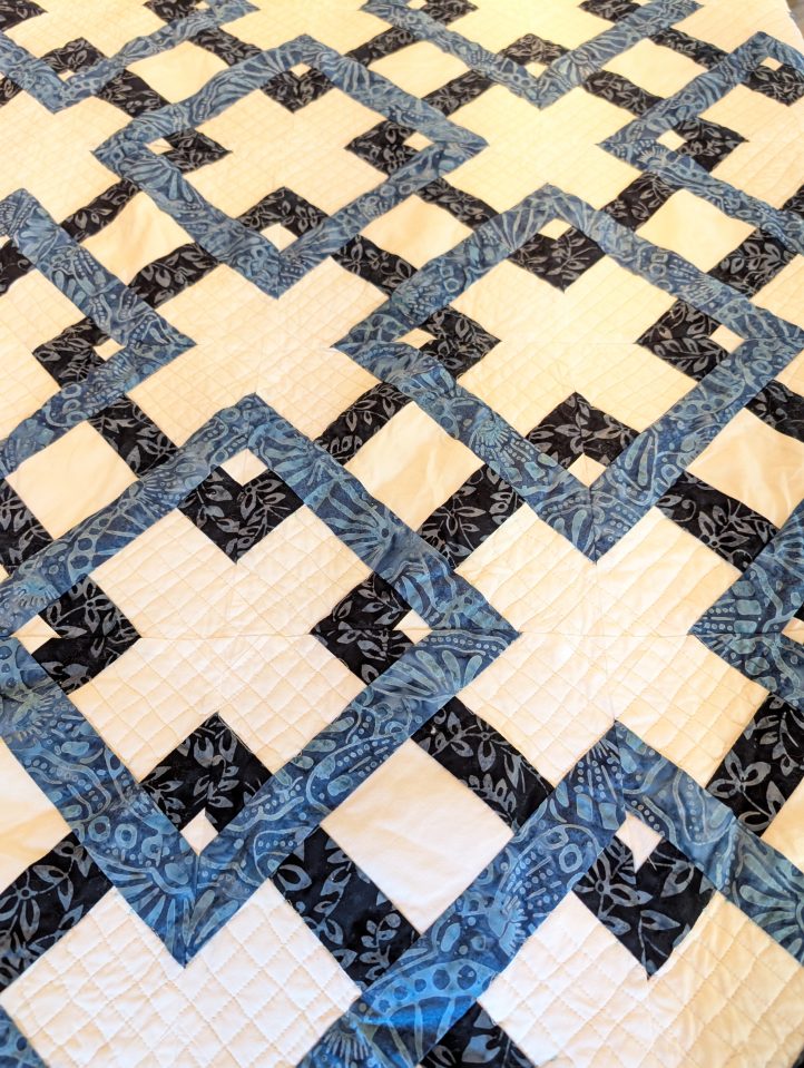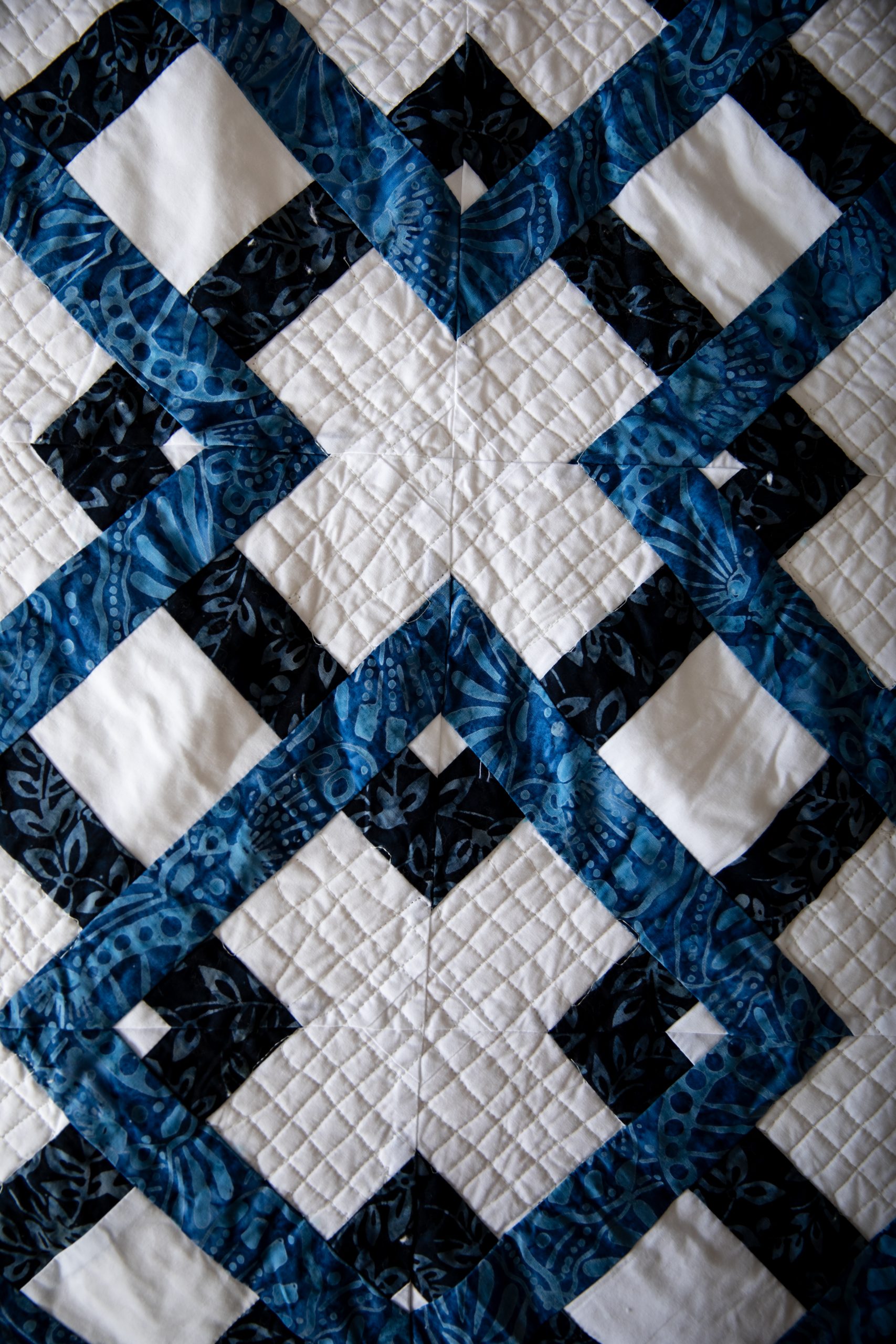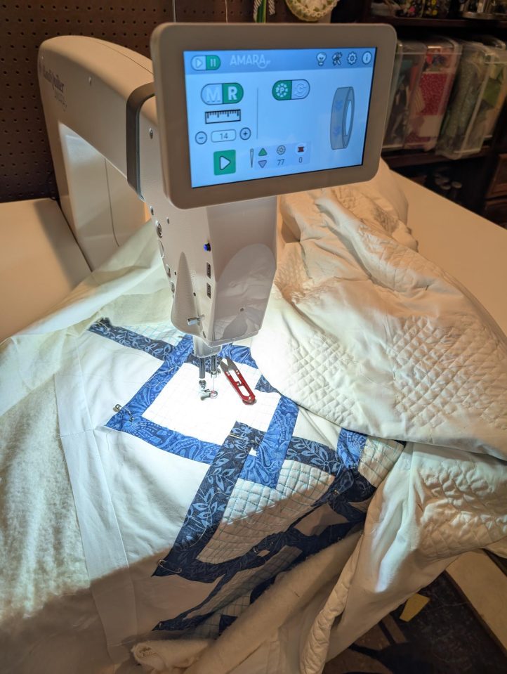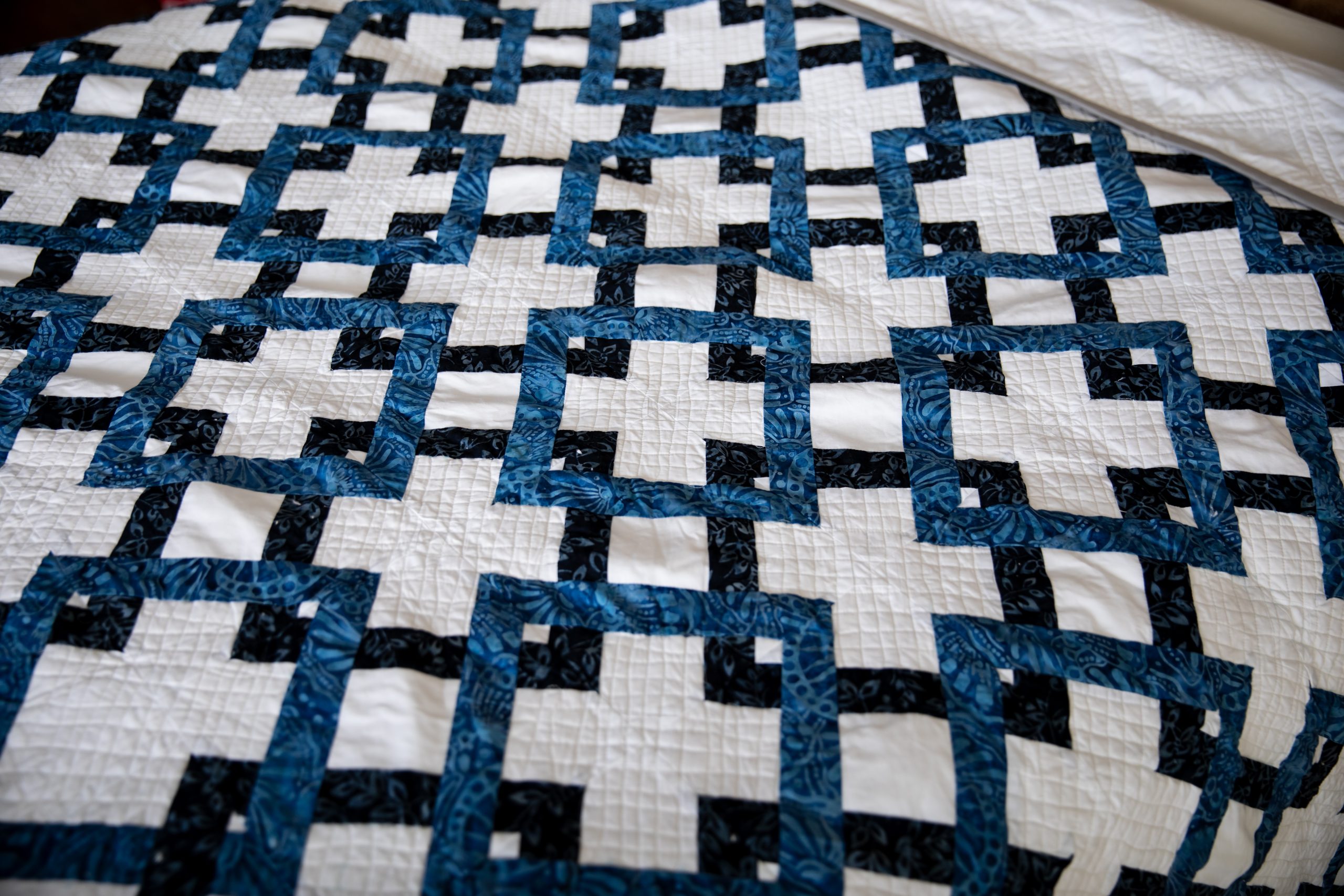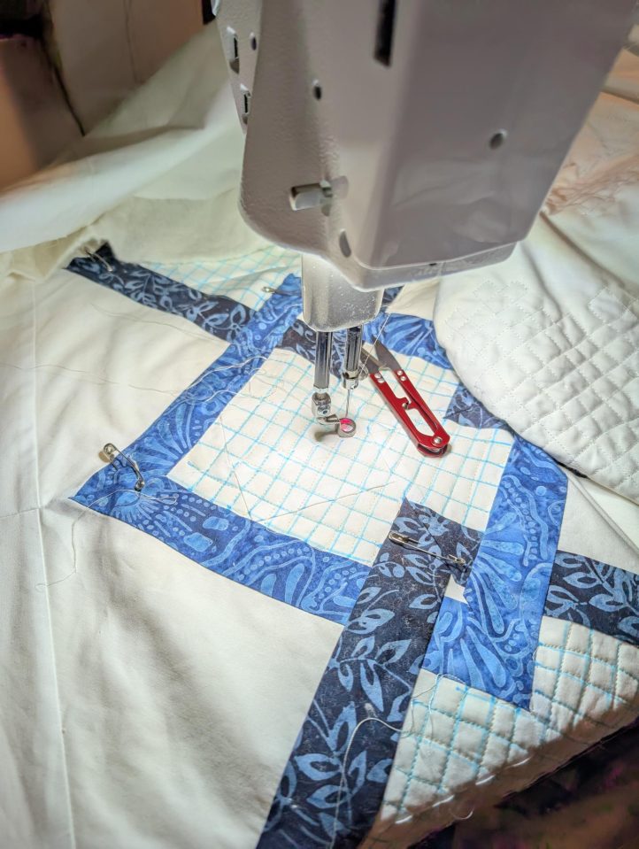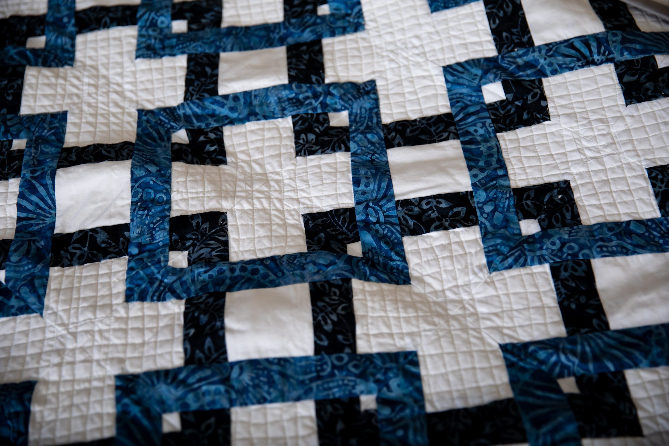 - Quilt as desired. Debi quilted a checker pattern in every large white opening. She then marked all her lines with an acrylic ruler and a water-soluble sewing marker. The lines were 1/2 inch apart. Debi quilted with a Handiquilter Amara ST for ease with such a large quilt.