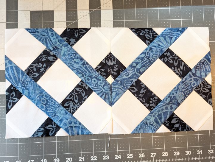- Stitch the long edge of (1) dark blue 3E to the left of the block and (1) dark blue 3E to the right of the block.