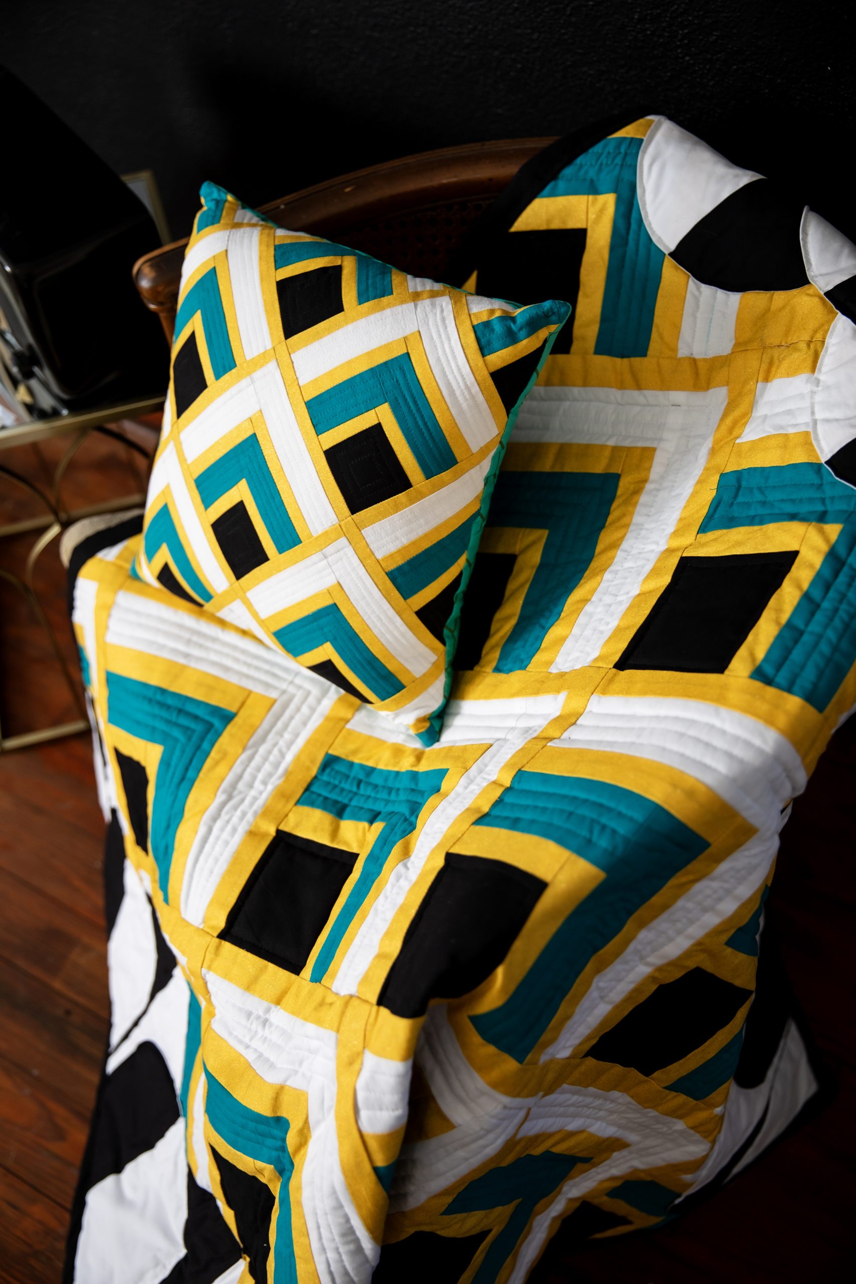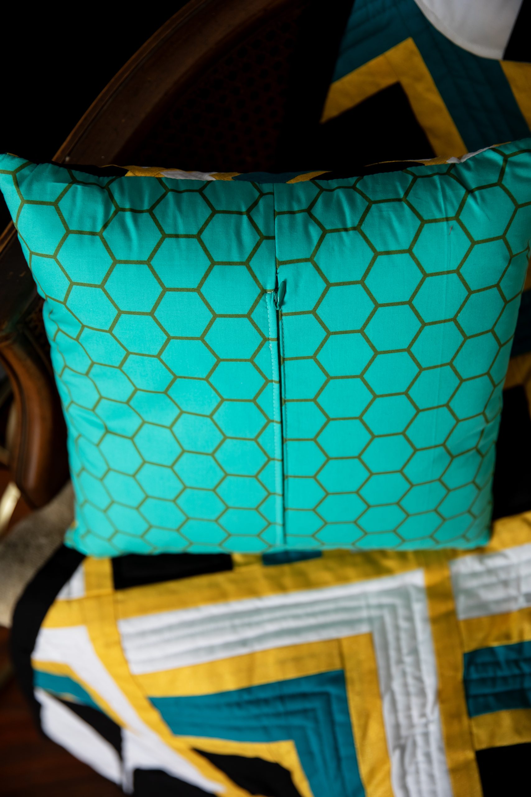 Design a cushion that embodies everything vintage glamour with this design from Sophie Tarrant. Made in rich shades of teal, gold and black, this Art Deco-inspired cushion gives the classic log block a modern spin. This cushion cover is made using thirteen mini blocks arranged to create an optical illusion effect and is completed with a zipper closure on the cushion’s back.