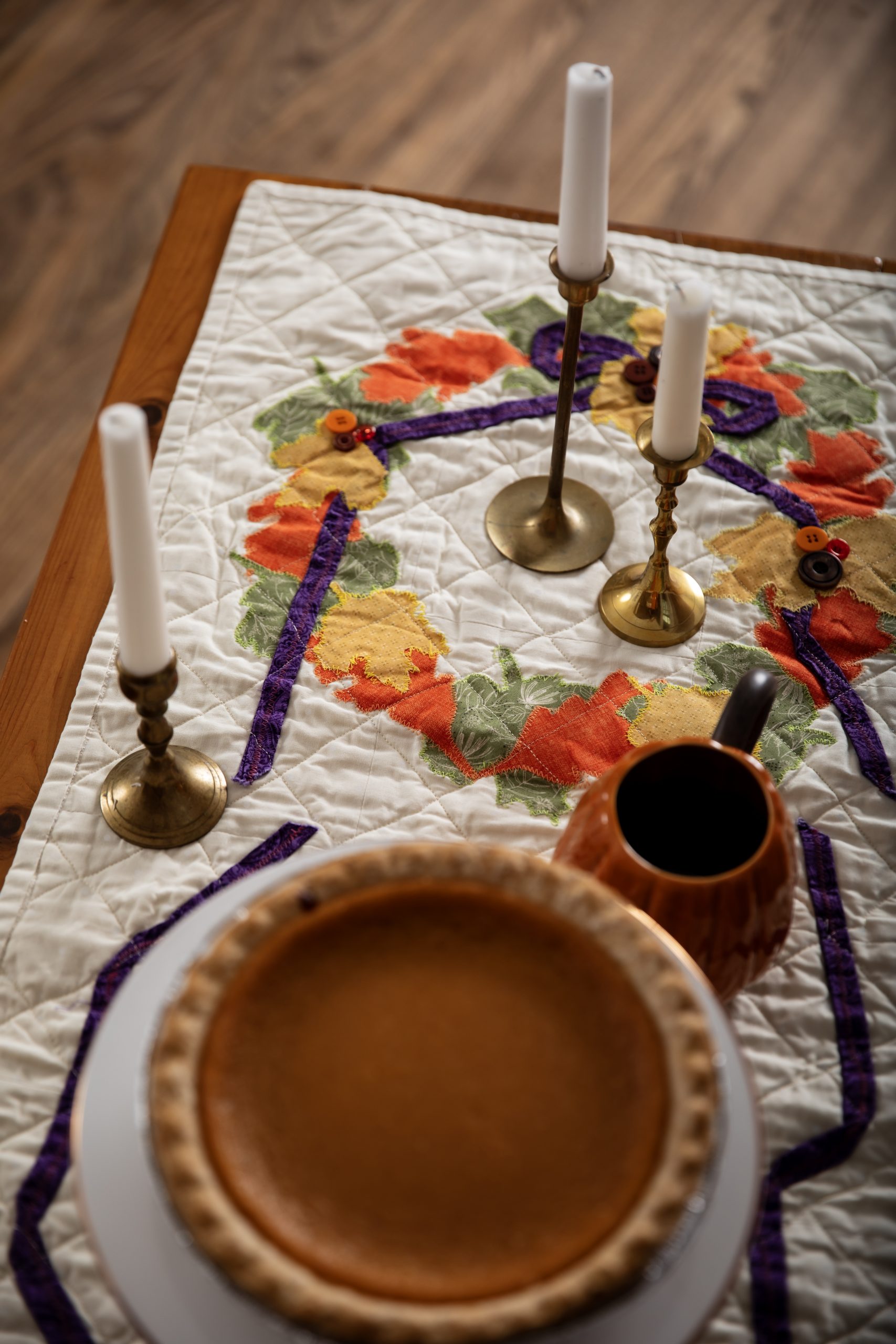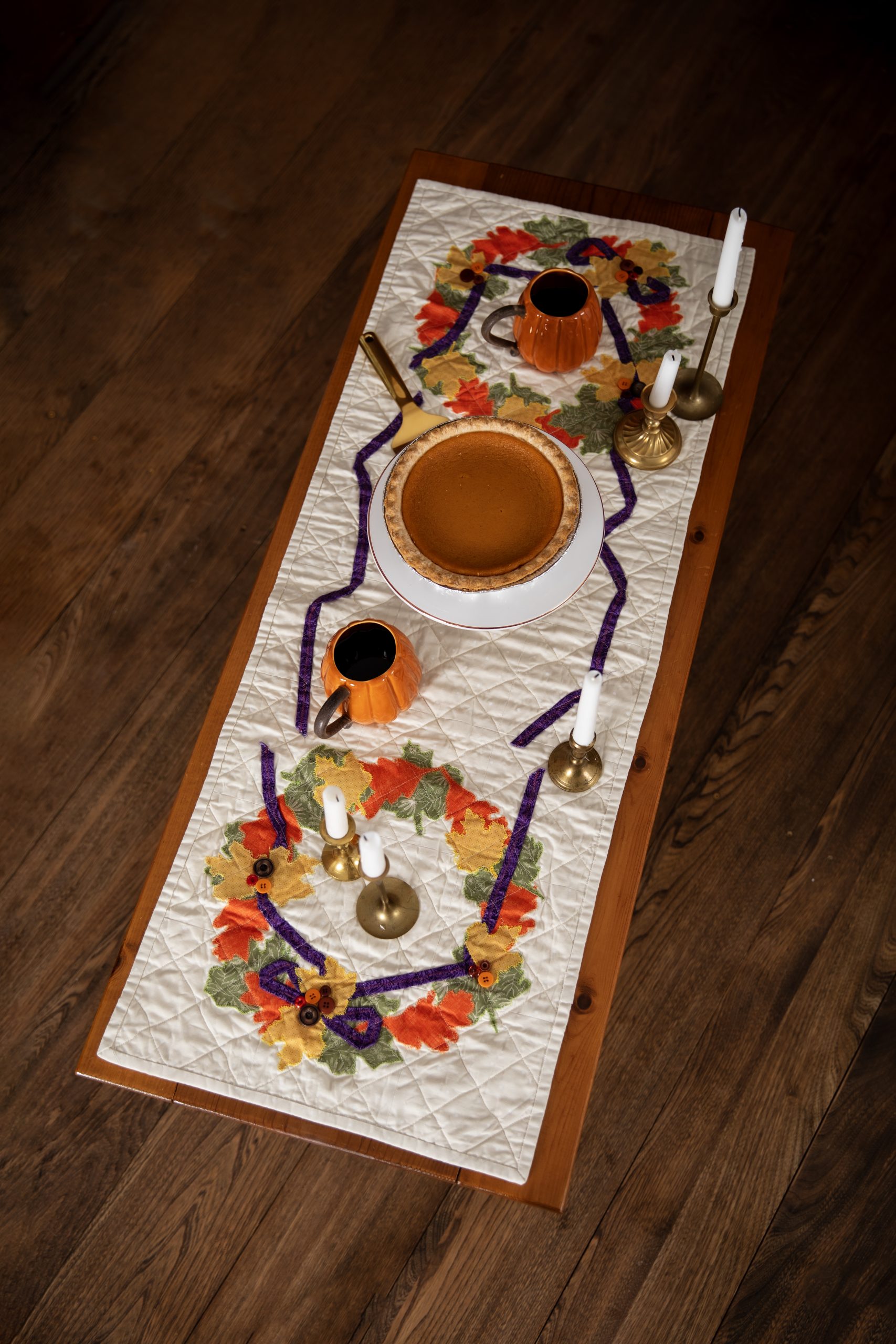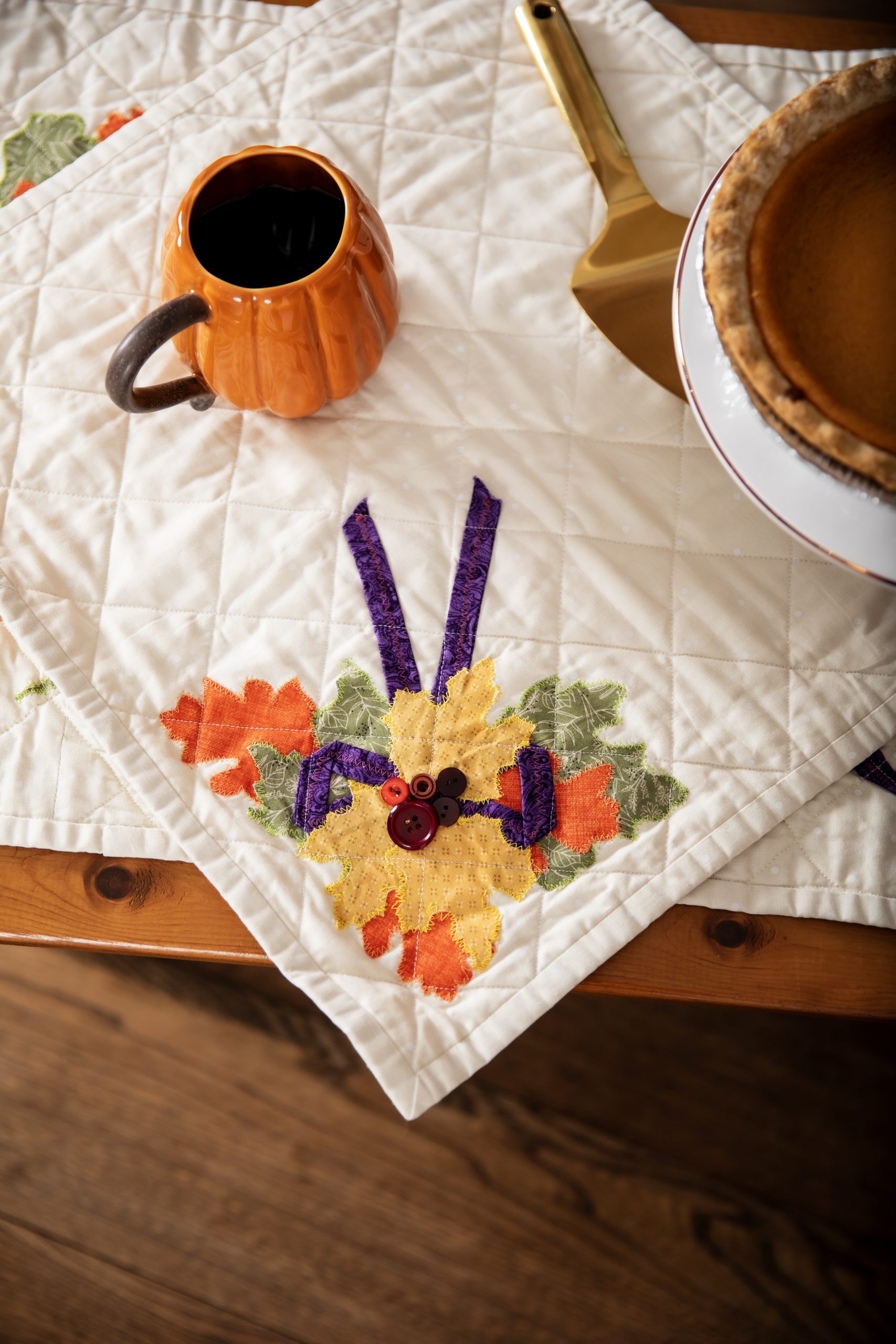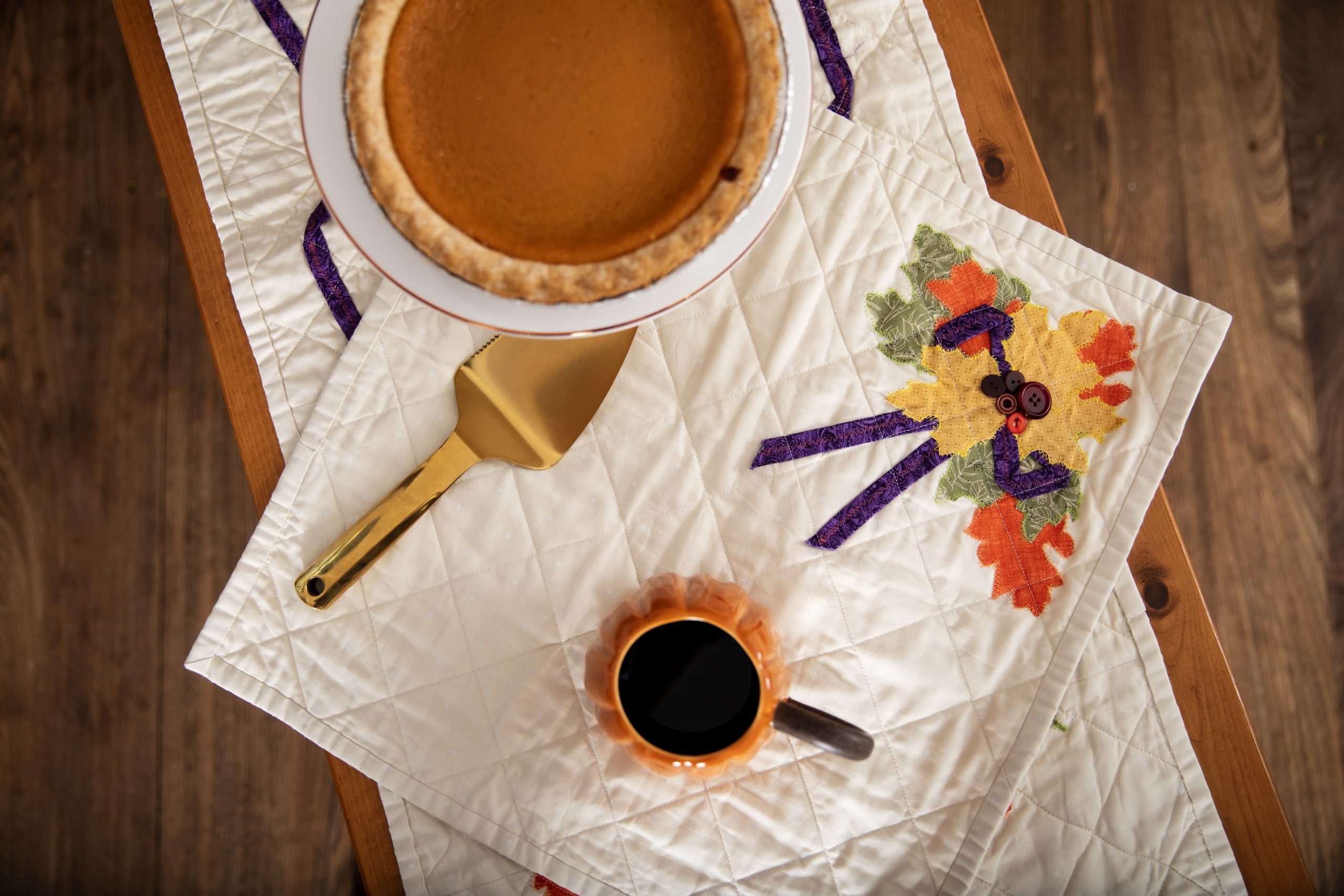 Set a beautiful, elegant table for Thanksgiving with this table runner and placemat pattern set from Debi Schmitz. Finishing at 18 inches x 48 inches, this table runner pattern features wreaths of colorful fall leaves intertwined with a sleek plum fabric ribbon. The matching Thanksgiving placemat pattern coordinates with a bouquet of fall foliage and is accented with button details.