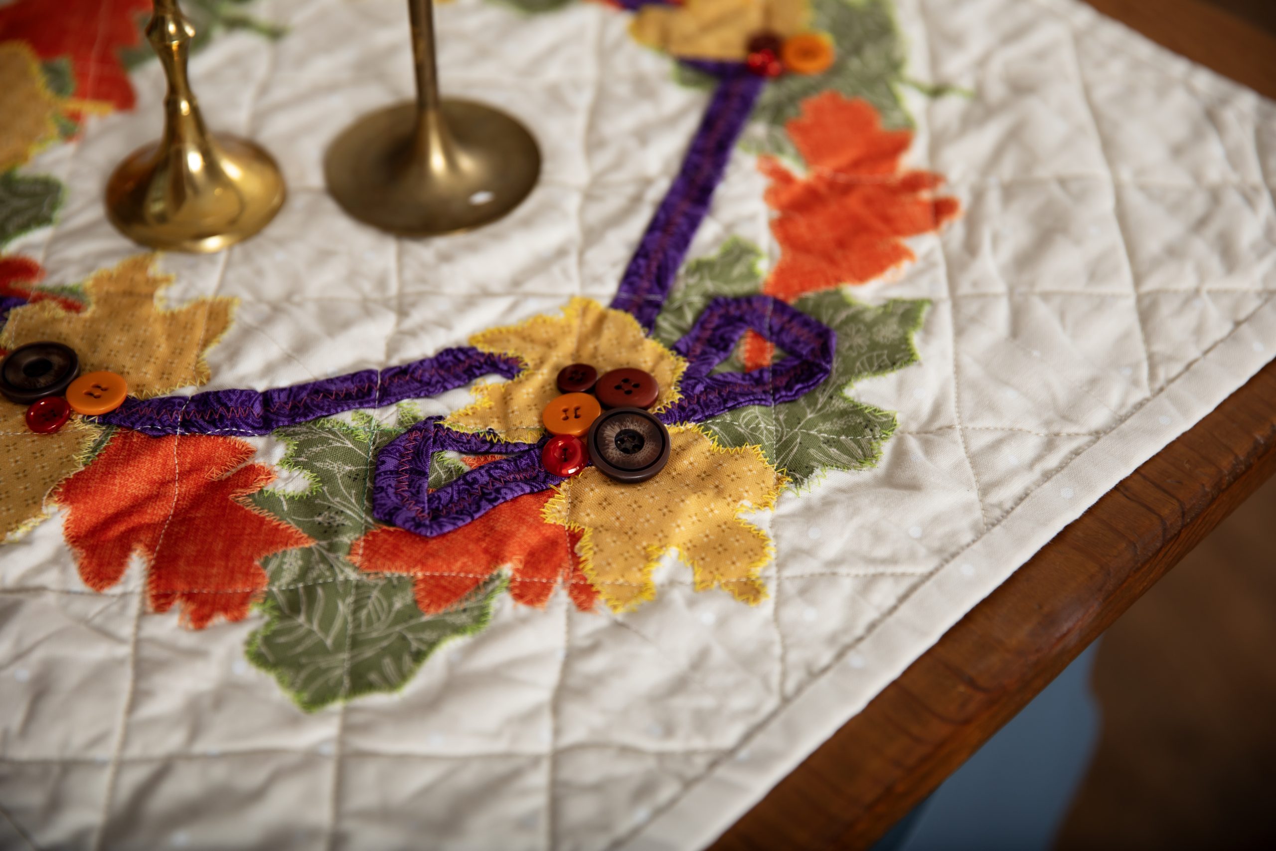- Stitch the buttons into the wreaths at the bows and on the ribbons as shown on the finished project image at the top of the page. Be sure to stitch between the layers of the runner so the thread doesn’t show on the back.