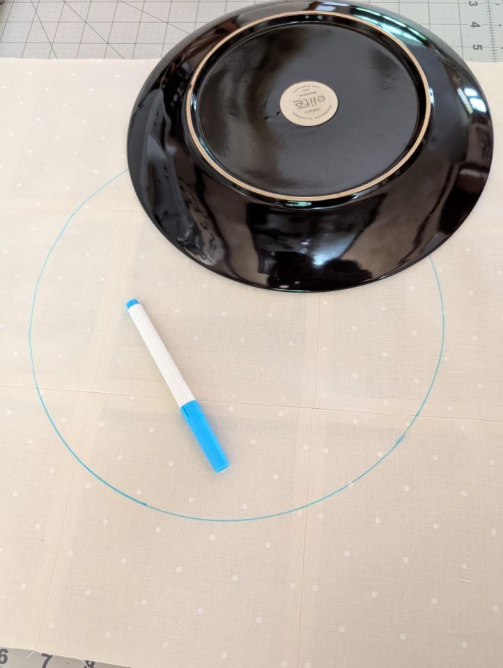 - Draw a circle around an 11” or 12” dinner plate or another large round object with a quilting water-soluble marker. It should be located 3” from the bottom edge and 3 1/4” from each side.