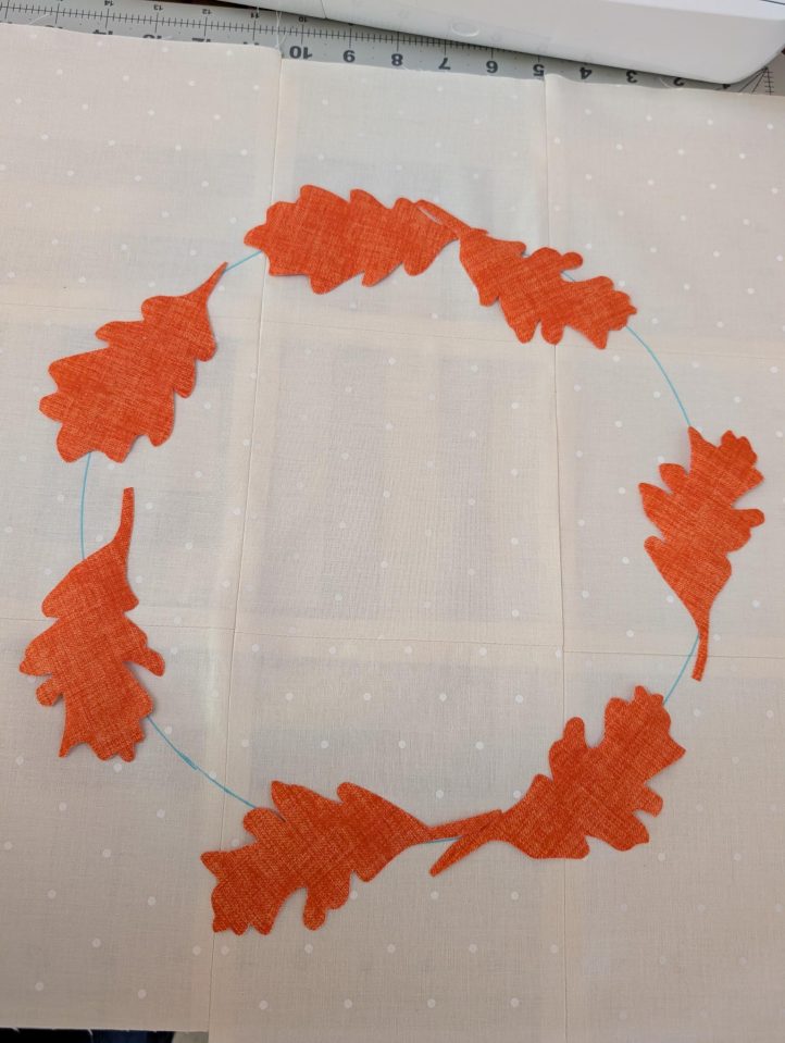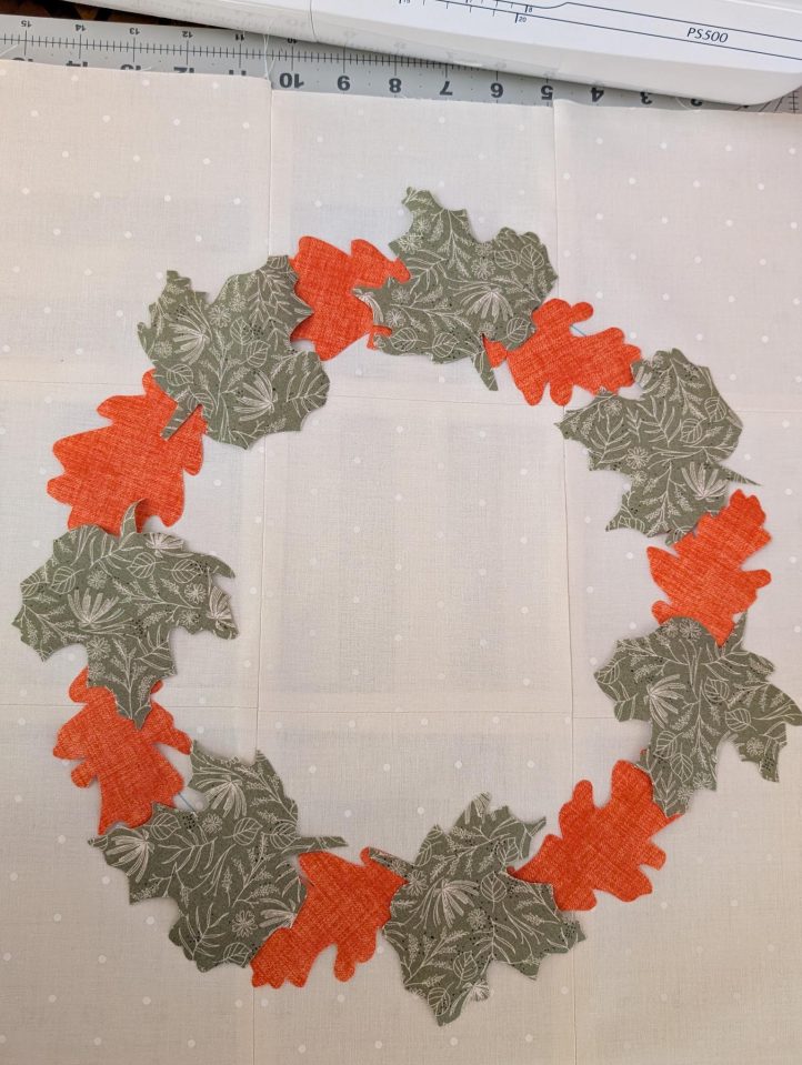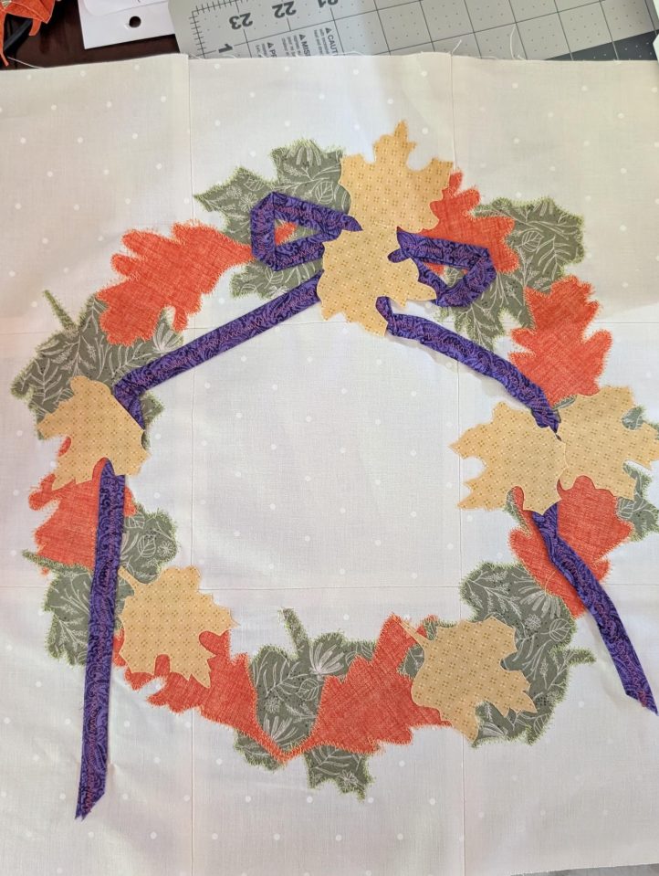 - Weave the ribbon ends around the wreath. Press and zig zag stitch the (7) gold leaves, Fabric D, with gold thread around the wreath and around the ribbon folds.
