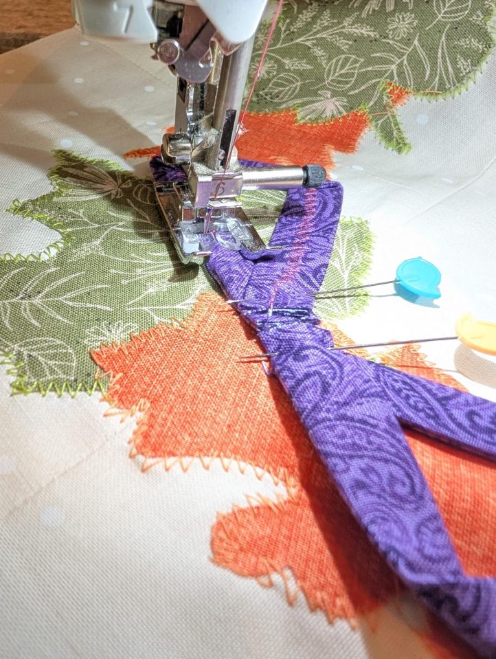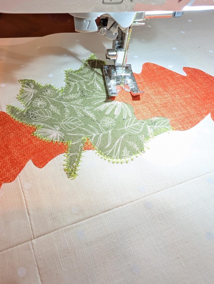 - Zig zag stitch around the green leaves with green thread. Zig zag stitch around the orange leaves with orange thread.