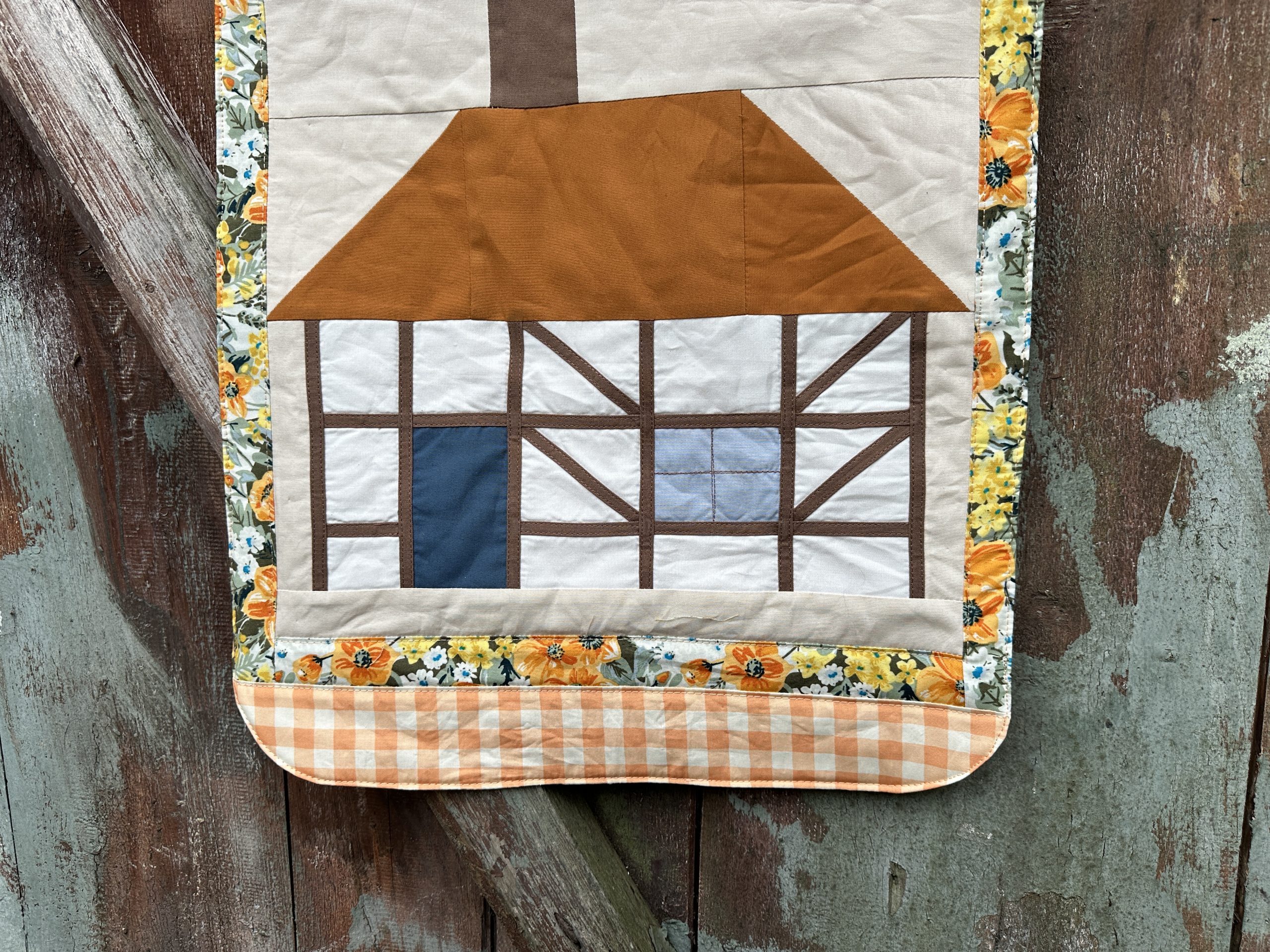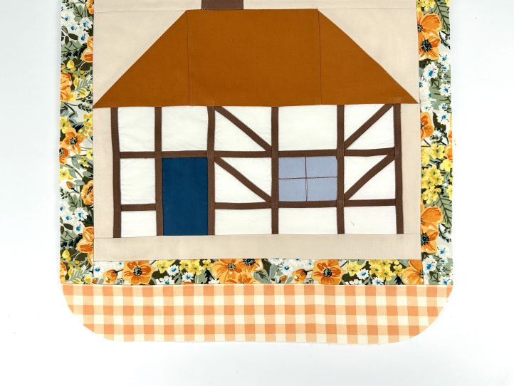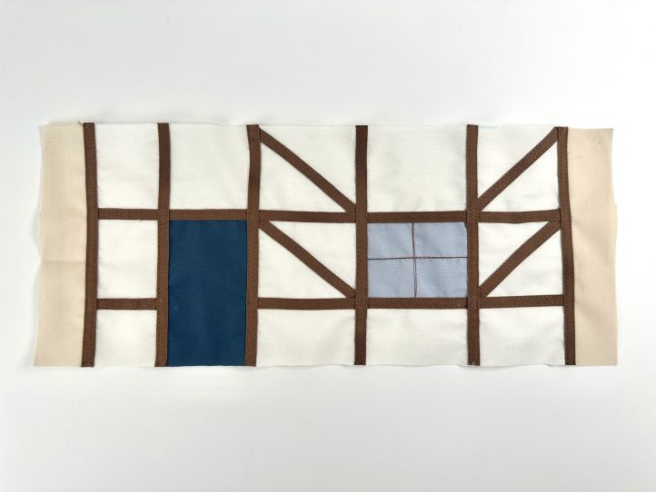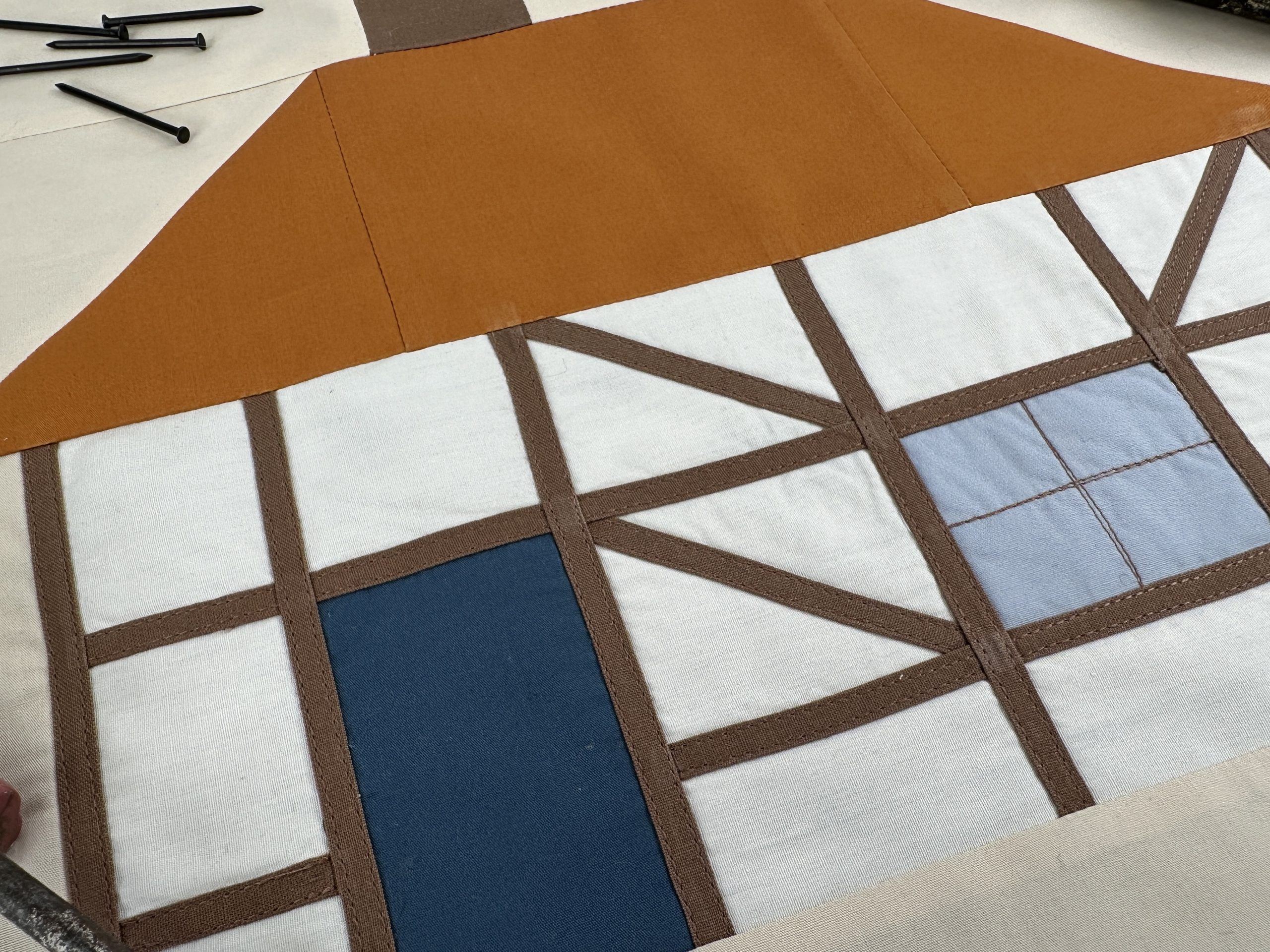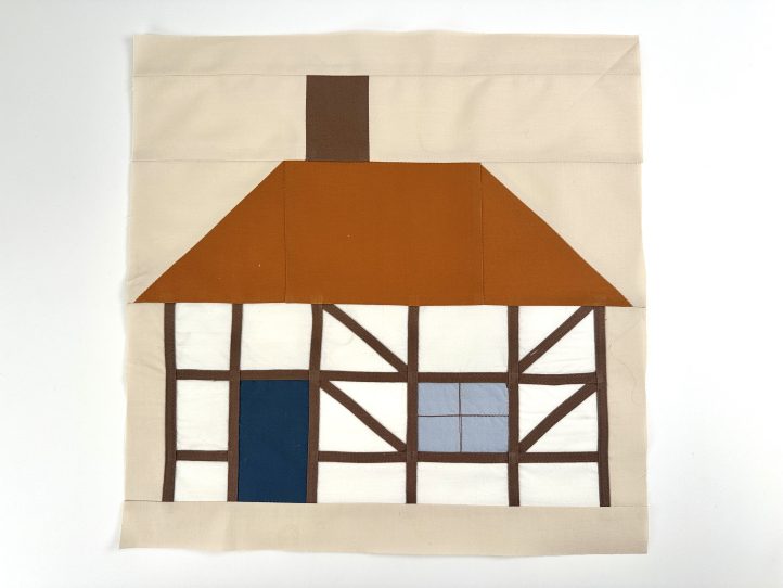 TIP: The bottom half of the house has some half timbering (made from those brown strips that you made back at the start), plus a door and window. All of these pieces are appliqued top a whole piece of ‘house fabric’.