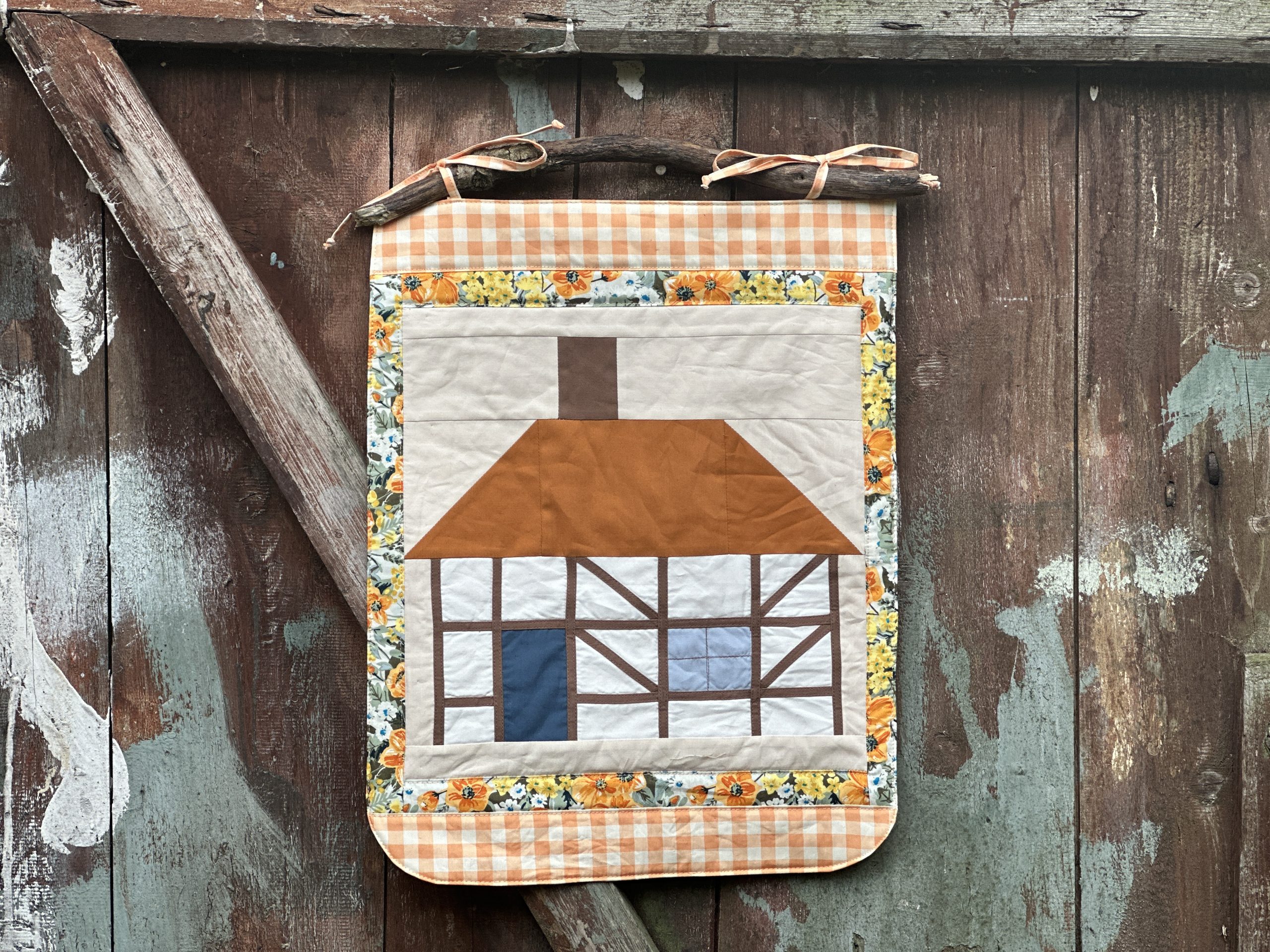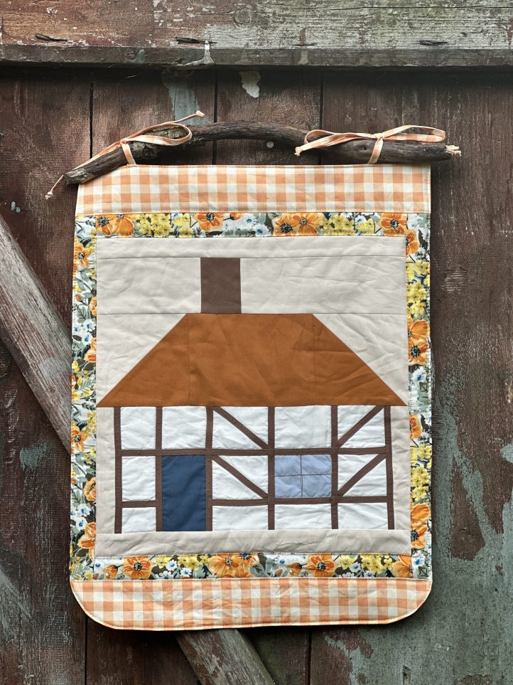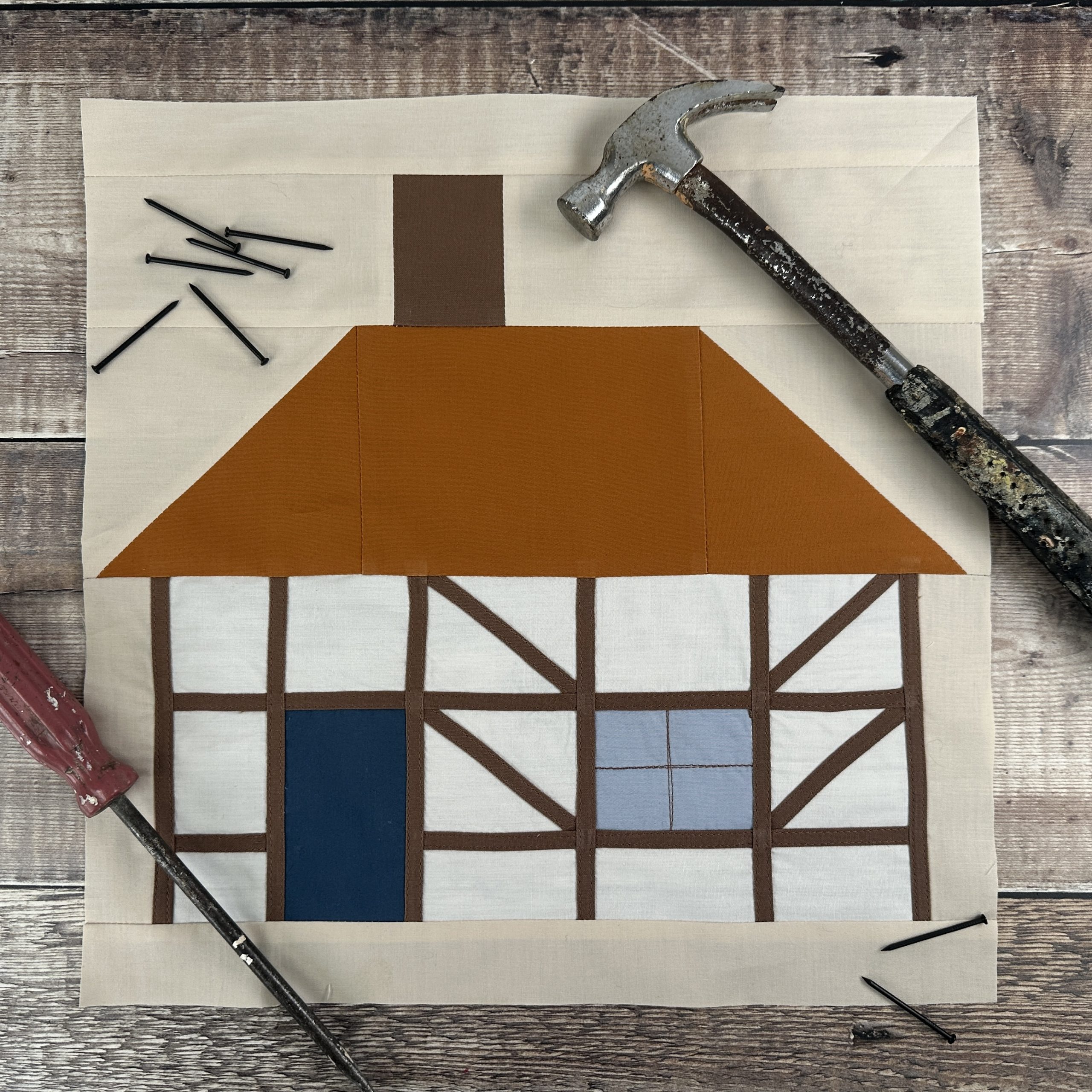 TIP: The bottom half of the house has some half timbering (made from those brown strips that you made back at the start), plus a door and window. All of these pieces are appliqued top a whole piece of ‘house fabric’.