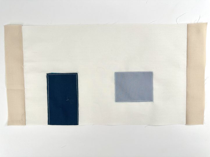 - Measure 1 1/2” along the bottom edge of the off white fabric from the left hand side and make a mark. Pin the door on here and attach with a narrow topstitch. Measure along 2 1/2” from the top of the door and attach the window the same way.