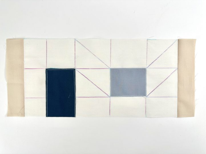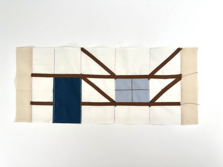 - Next, come the horizontal timbers. One goes on top of the door right across to the right hand side wall and the second is cut so that a small amount goes to the left of the door and the remainder, across the right. Sew them on.