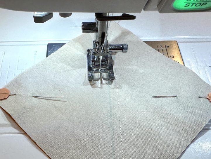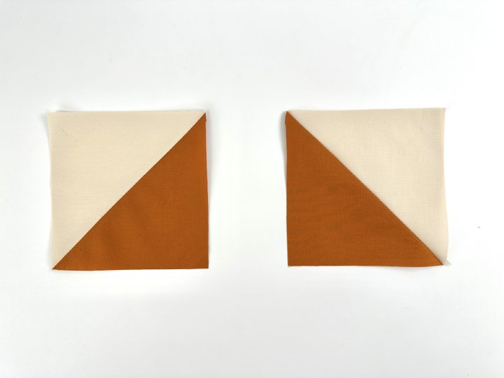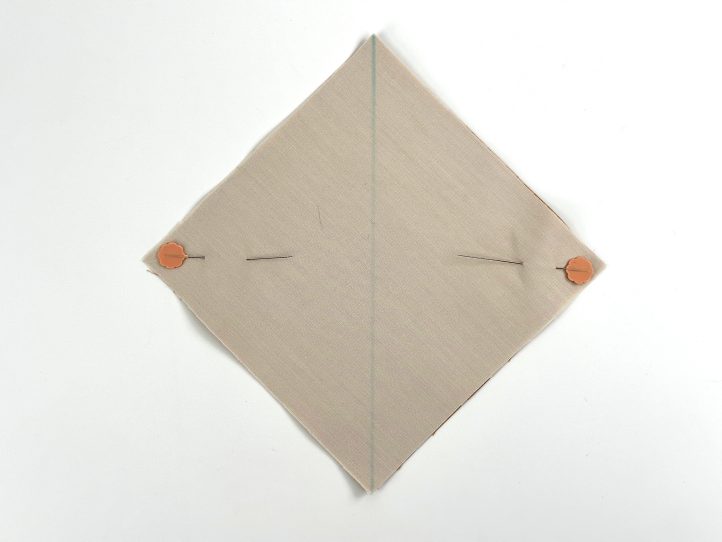 - Lay the two square pieces cut for the end of the roof right sides together and pin. Draw a diagonal line from one corner to the opposite.