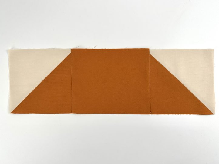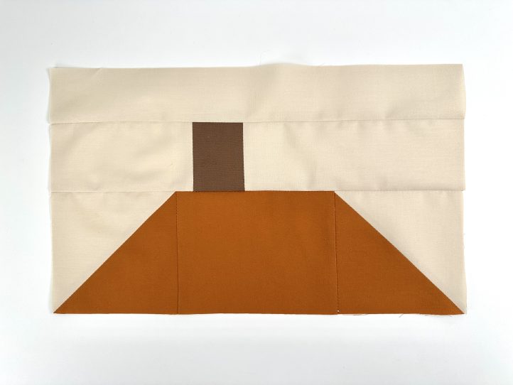 - Join Strip A to the top and press. Join a half square triangle unit to each end of the roof taking care that everything is aligned the right way. Press and then join the sky and chimney strip to the roof.