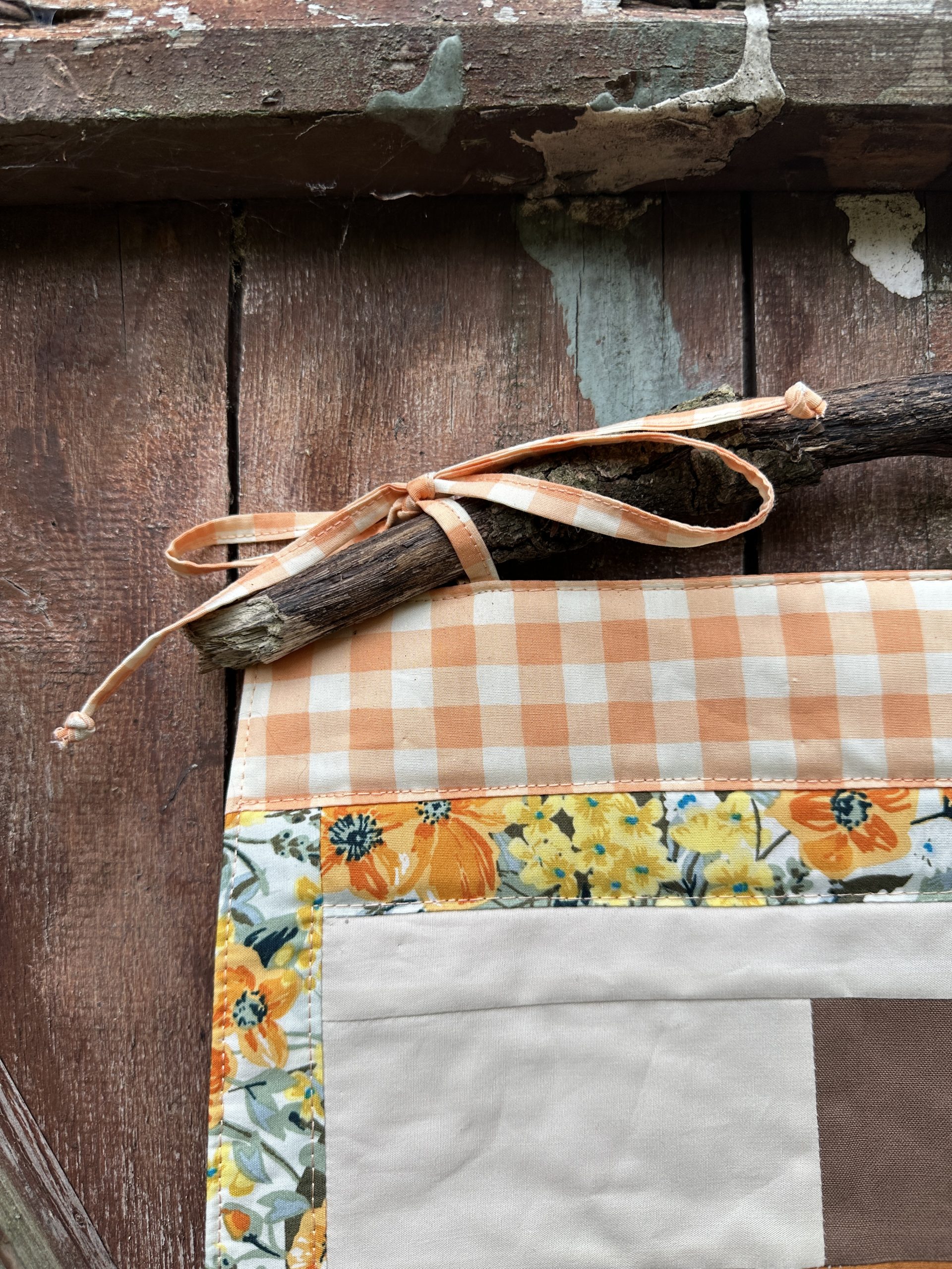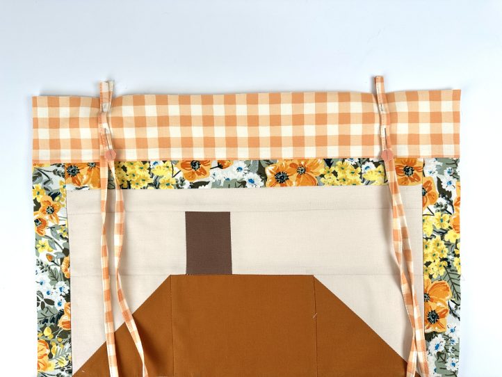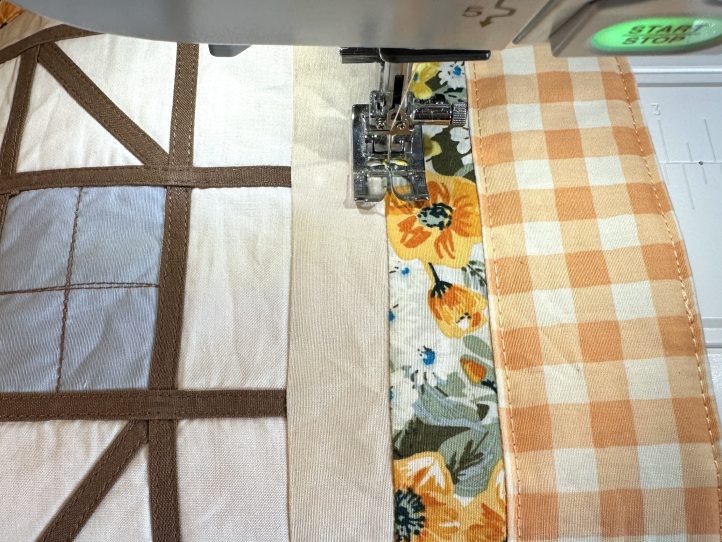 - Topstitch around the outer edge about 1/4” in from the edge. Also, topstitch across the top of the gingham panels and around the edge of the floral one.