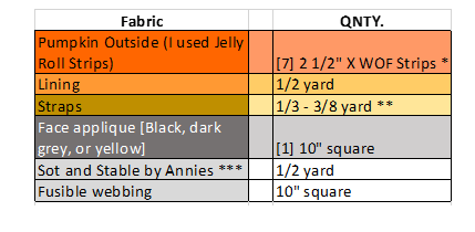 - Pumpkin outside (designer used jelly roll strips) – [7] 2 1/2” x WOF strips