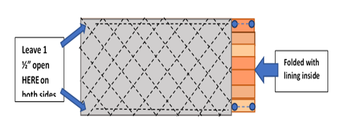 - Once the straps are laced through the upper casings and the ends are evened up, you will insert them into the bottom of the side seam you left open on the bottom of the quilted outer bag. Both of the ends of the right strap go into the hole on the right side of the bag. Both of the ends of the left strap go into the hole on the left side of the bag. Pin the straps in place and turn the entire bag inside out.
