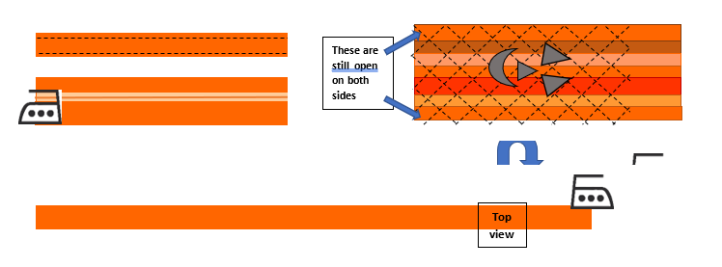 - Now open the strap on the fold and turn the two raw edges into the center and press.