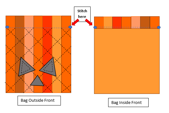 - Now fold the bag in half on the line drawn in the middle of the strip set. Start sewing 1 1/2” from the fold all the way down both sides. Sew to where the quilting on the outside of the bag ends and stop. Lock your threads in place.