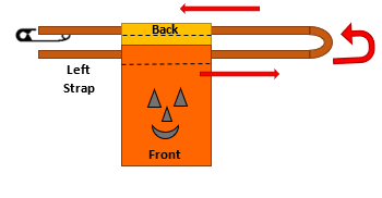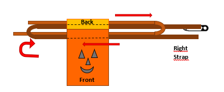 - Starting from the left side, thread the left strap through the front facing, moving from left to right. Both ends should be on the left side of the bag. Even up the ends so they are exactly the same length.
