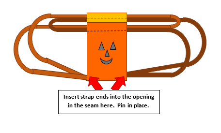 - Choose which jack-o’-lantern face you would like on your bag. Trace the face template onto the paper side of the fusible webbing. Iron the fusible webbing to the wrong side of your 10” square of black/gray/yellow face fabric. Cut out the face on the drawn lines. Arrange the face on the cinch sack as shown in the diagram. Iron the face in place. Stitch down the face using an applique, blanket, satin, or straight stitch. The side with the face will be the front of your bag.