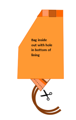 - With the bag inside out, pull the unsewn side seam corner through the opening in the bottom of the lining. Pull about 12” of both ends of the strap through the hole. Sew the side seam shut. Go over the seam 3 or 4 times to make sure there is a firm hold on the strap ends. Trim the excess strap you pulled through the hole off using scissors. Do this on both side seams and with both straps.