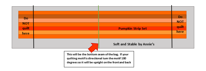 - Layer the strip set with the markings on top of the Soft and Stable, right side of both facing up. Quilt the strip set to the Soft and Stable. You can do whatever you like but do not go past the 4 inch mark on either end. The middle mark will be the bottom of the cinch sack, so if you are using a directional quilting motif, make sure to change the orientation 180 degrees so it will be right side up on both the front and the back.
