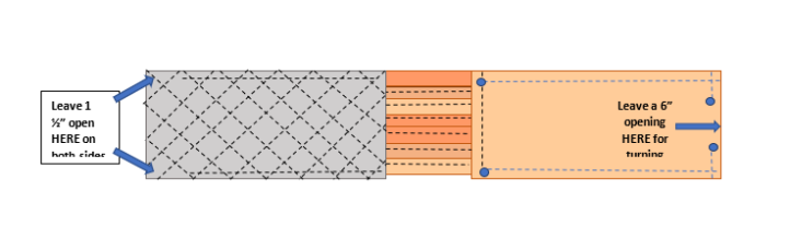 - Now it is time to feed the straps through the casing. Each strap will go through both casings. Read carefully so your bag will cinch when it is complete. Use a safety pin to thread the straps through the casing.