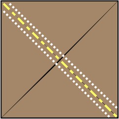 - Using 5” squares, draw a diagonal line on wrong side of two Fabric 1 squares. Layer right sides together with Fabric 2 and Fabric 3 squares. Sew 1/4” from each side on the drawn line.