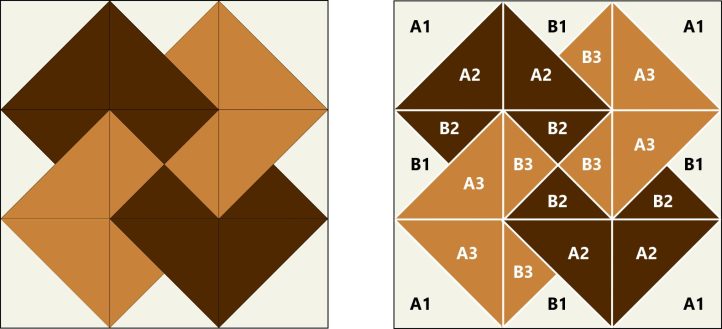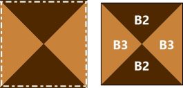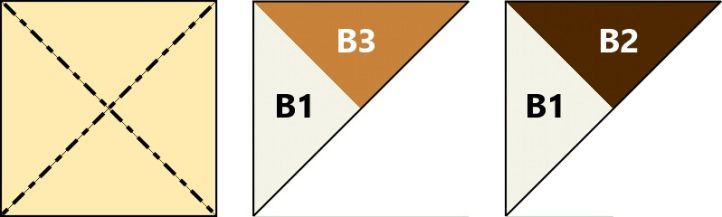 - Cut the remaining 5-3/8” squares in half diagonally twice to make QSTs. Join as shown to make two pieced triangles of each variation. Press seams toward B2 or B3.