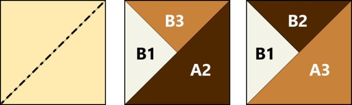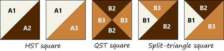 - Cut on the drawn lines to make two each of A1/A2 and A1/A3 HST squares. Press seams toward A1 . Trim to 4-1/2” square.