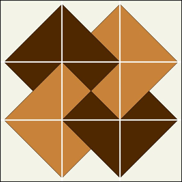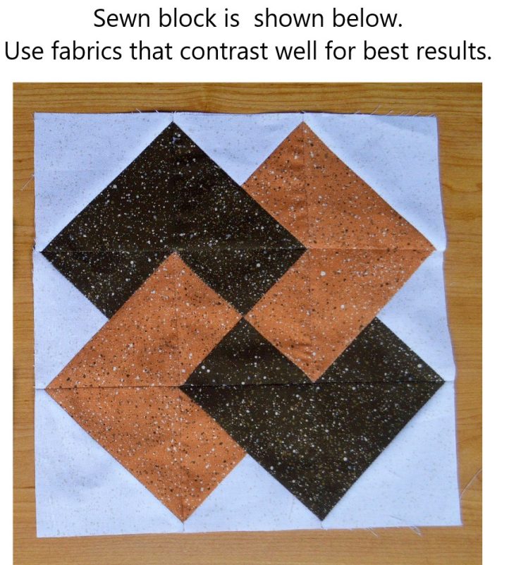 - Paying attention to their orientation, combine squares as shown to complete the block. Press seams so they nest or open to reduce bulk. Trim to 12-1/2” square.