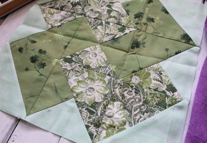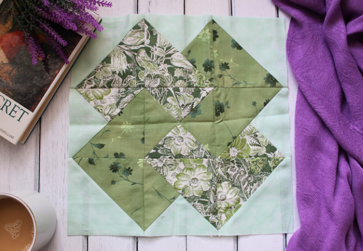 - Aligning the 45-degree line on your ruler with one of the square’s seams, measure from the center of the square out to trim so that the square measures 2-1/4” from center on all four sides. The resulting square should measure 4-1/2” square.