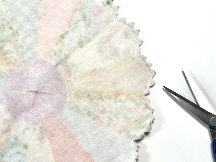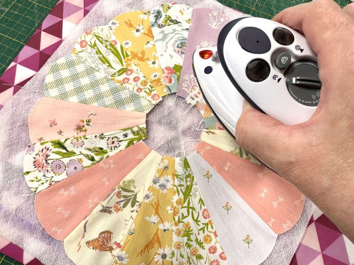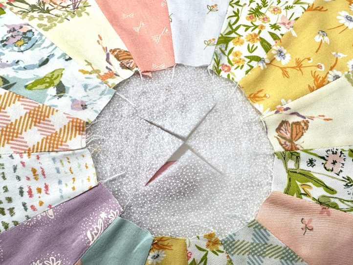 5. Interface each Dresden plate with H630 interfacing, carefully avoiding the open center (we can use the glued area to attach the center in the last step) and then trim the interfacing around the outside edge to the exact size and shape as the Dresden.