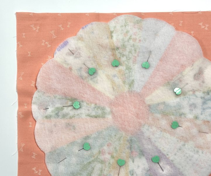 3. Place the interfaced Dresden right sides together onto the appropriate, untrimmed backing square and pin well.