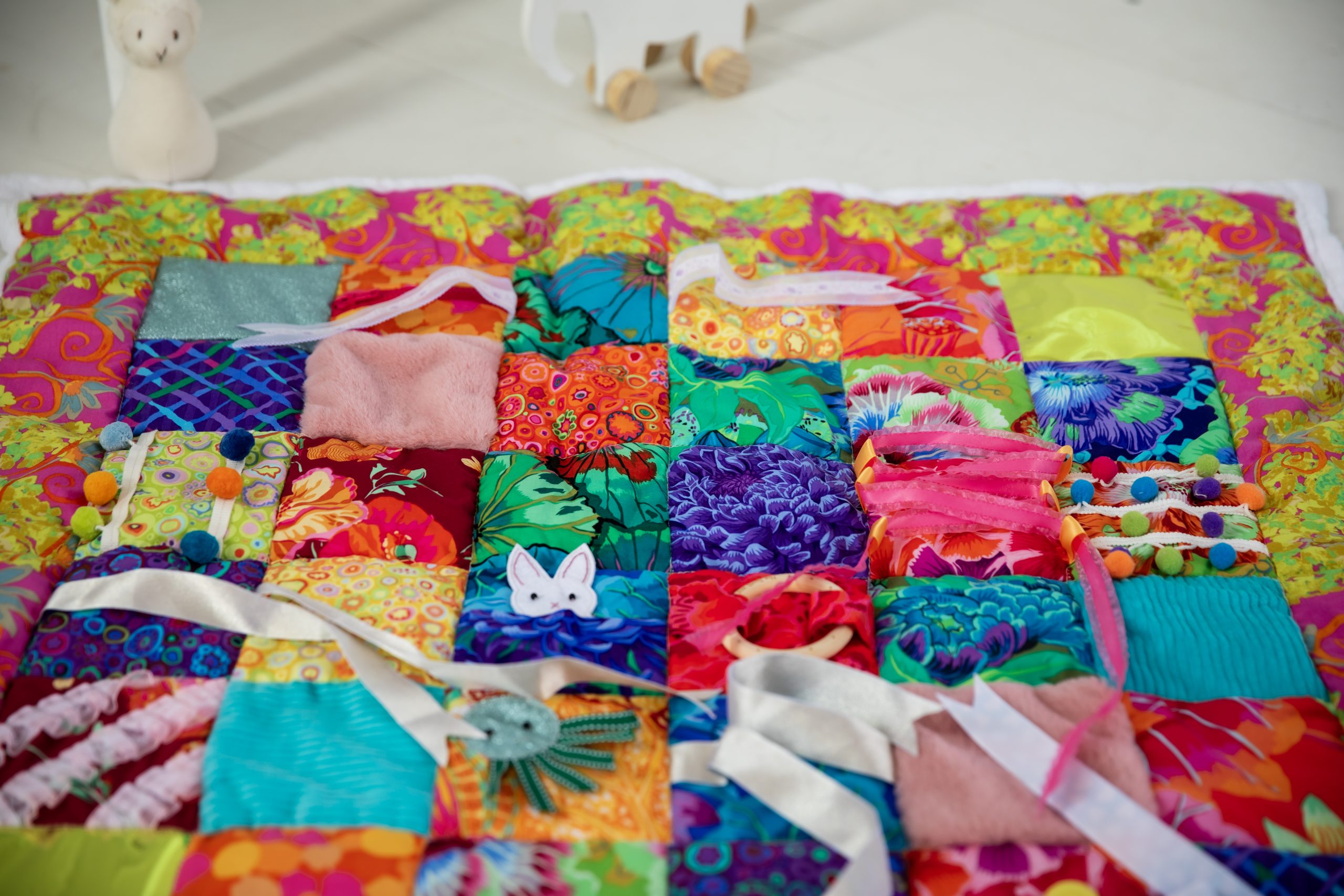 • Distribute your crinkle squares, pom poms, ribbons, and glitter pieces evenly across your quilt. This ensures every part is engaging and avoids clusters of similar textures.