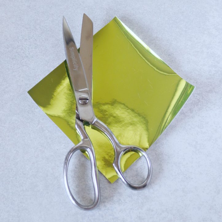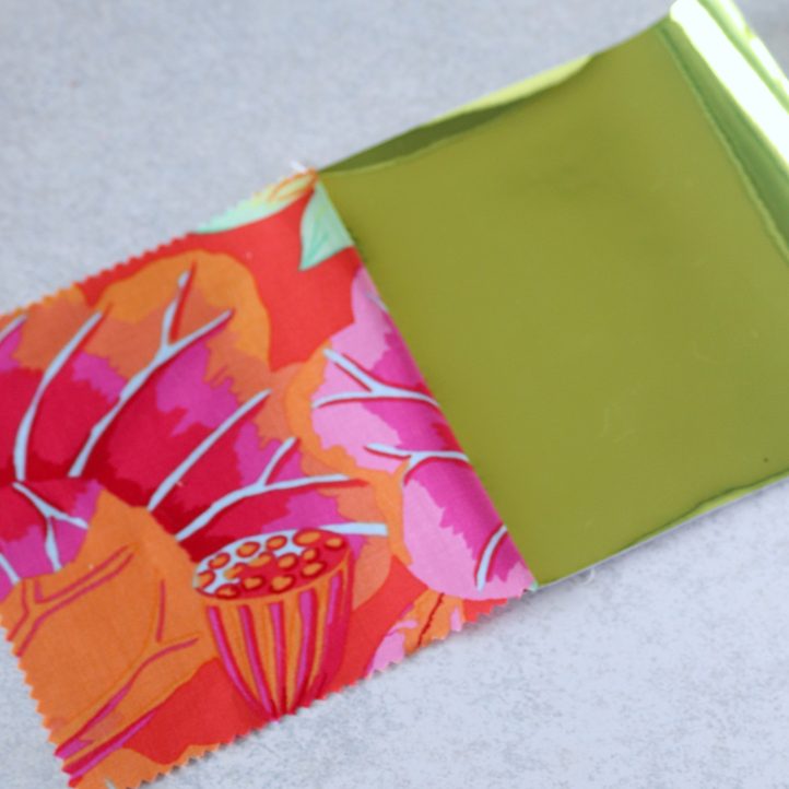 1. This quilt is made up of (36) 5-inch squares – the majority come from a pre-cut rainbow charm pack (which saves a lot of time!), but you will also be adding a few extras of your own to include additional sensory details. Begin by cutting two 5-inch squares from a sheet of mirrored green vinyl.