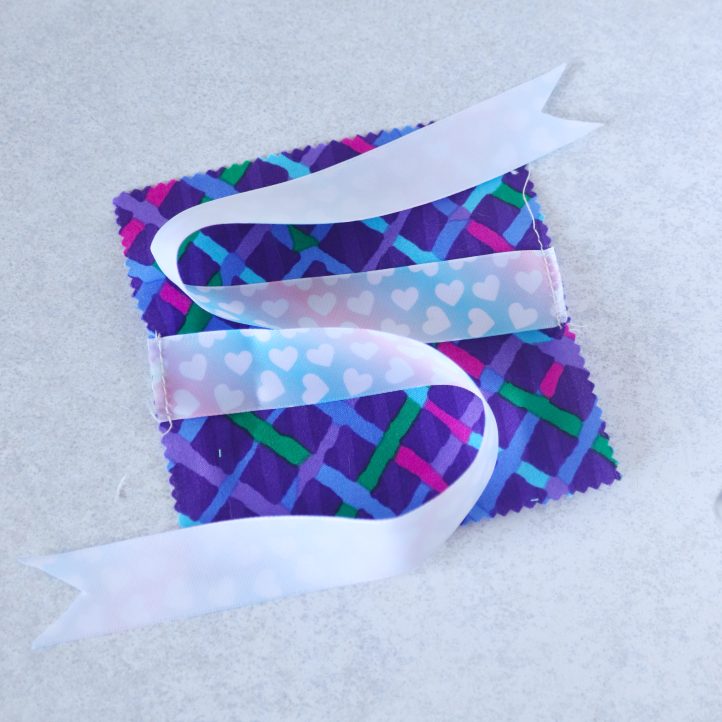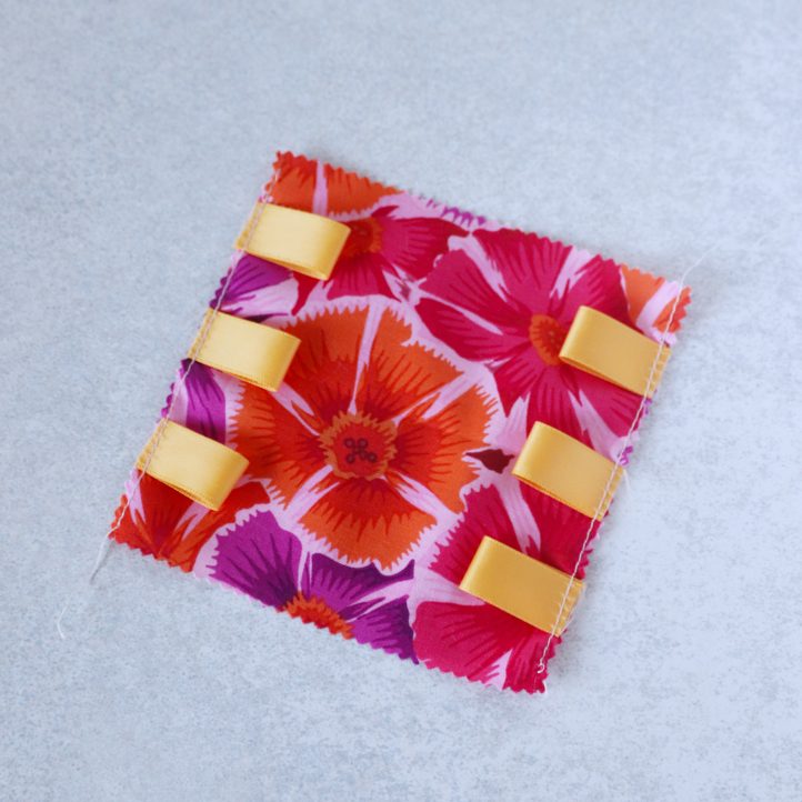 11. Take another ribbon and cut six 3-inch pieces. Fold each piece in half and pin them along the side edges of a charm pack square, aligning their raw edges with the fabric. Baste to hold in place. When the quilt is complete, thread another ribbon through these ties and fasten it, like a shoelace.