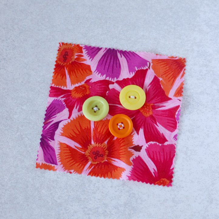 12. Stitch a handful of large buttons onto another charm pack square. Be extra careful – choose buttons large enough not to be swallowed by a child and sew them on very securely. If in doubt, skip this step and make another favorite square instead.