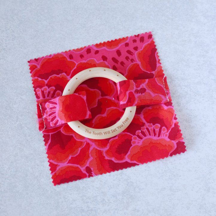 13. Take a charm square and cut it in half. Fold each piece in half lengthwise with right sides facing and sew along the long edge to make two tubes. Turn them right side out, roll slightly so the seam runs down the center back side, and press flat to make two strips. Fold each strip in half, thread them through your preferred teething ring, then place this onto another charm square and baste along each side to secure. Trim away any excess strip that extends beyond the edge of the charm square.