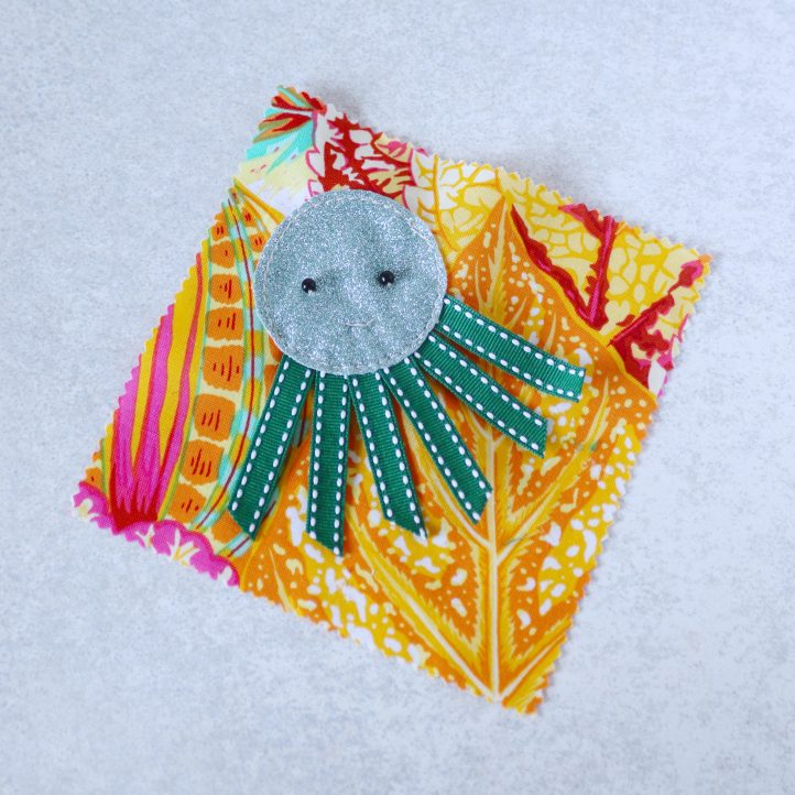 14. This is another favorite of ours – the octopus! Cut a 2-inch circle from your blue glitter cotton and six 3-inch lengths of ribbon (yes – we know an octopus technically has eight legs – but that looked a little crowded so we opted to give ours six, instead). Position the ribbons on a charm square, then place the glitter circle on top to create an octopus. Stitch around the edge of the circle to secure, then embroider a smiling mouth and add two black seed bead eyes.