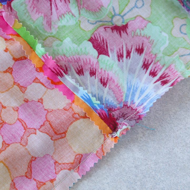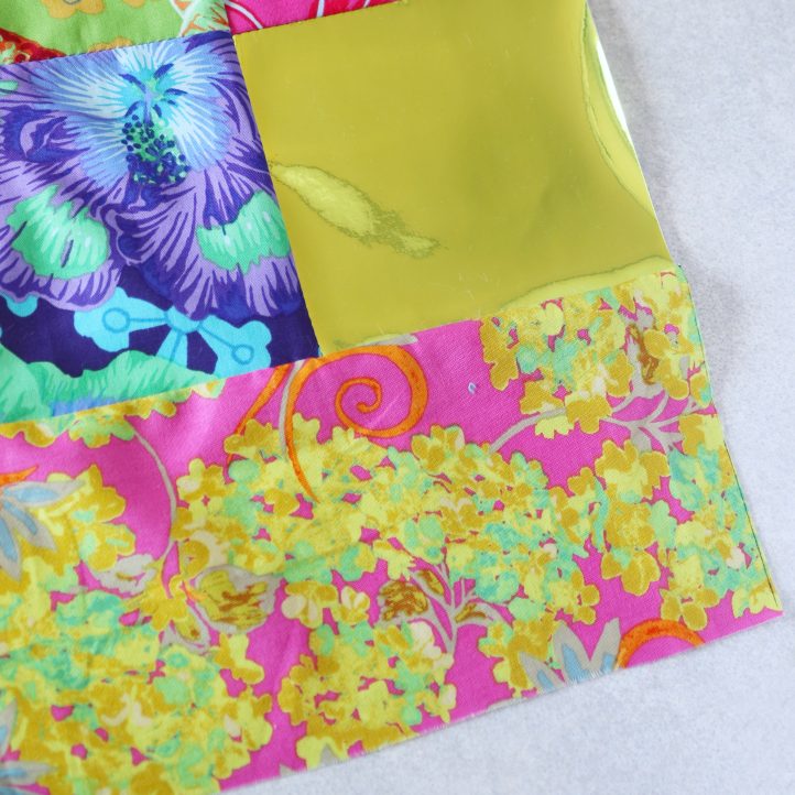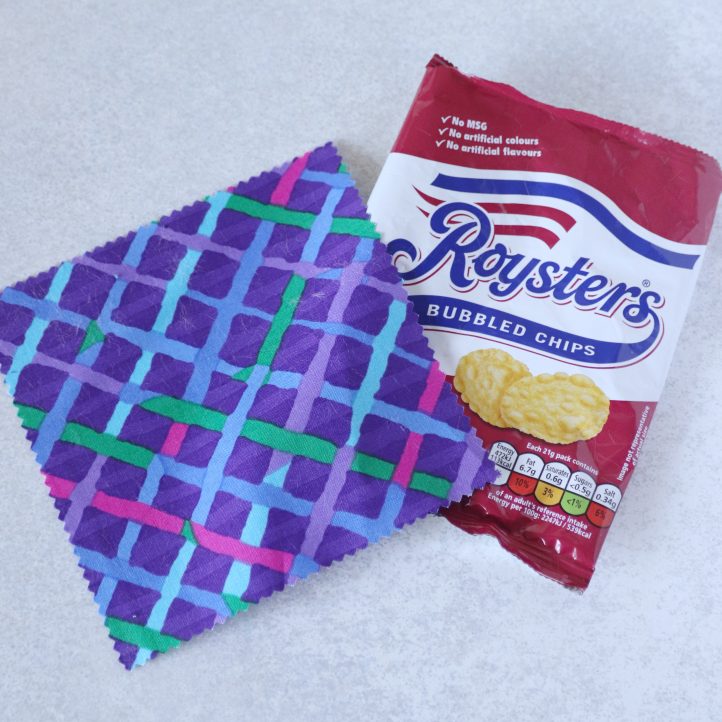 6. Make crinkle squares – yes, using potato chip bags! Take two small empty chip bags, wash them, and leave them to dry thoroughly. Place one bag flat against the wrong side of a charm pack square, then baste around the edge to hold it in place. Trim any excess chip bag so your square measures exactly 5 inches. Repeat to make another crinkle square in the same way. When the quilt is finished, these layers will rustle together when they’re touched, creating a fun, satisfying crinkling sound.