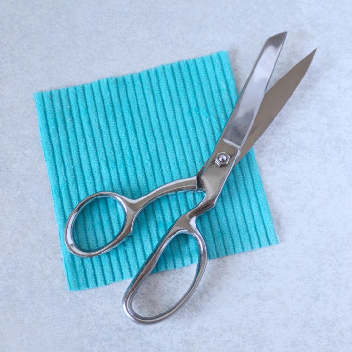 2. Next, cut two 5-inch squares from bright blue jumbo cord.
