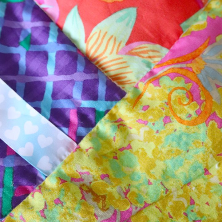 10. Cut and stitch lengths of different colored ribbons to the edges of several other squares to create ribbon tie pieces.