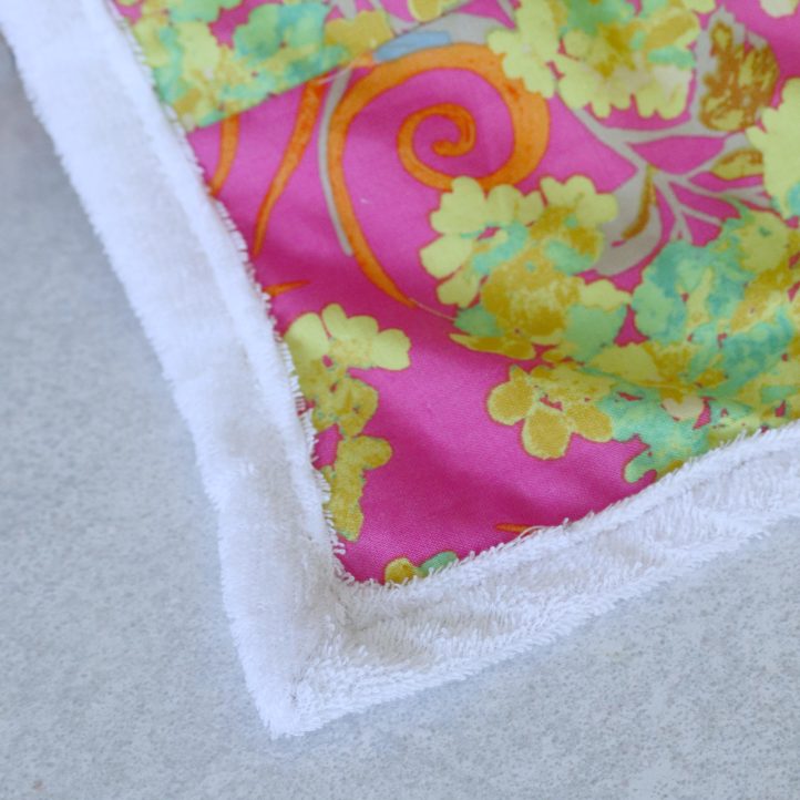 • Fabric: One rainbow charm pack; Pink floral cotton, one yard; Toweling, 1-1/2 yards; Plus pink faux fur, green mirror finish vinyl, blue glitter cotton, and blue jumbo cord – One fat quarter of each