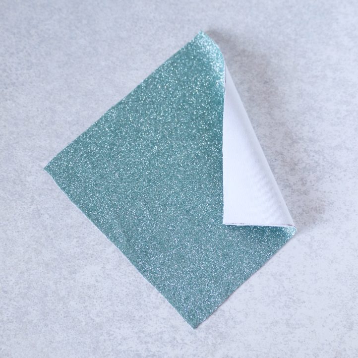 4. Cut two 5-inch squares from a sheet of blue glitter-coated cotton. Keep the excess from this piece – you’ll use it in a later step.