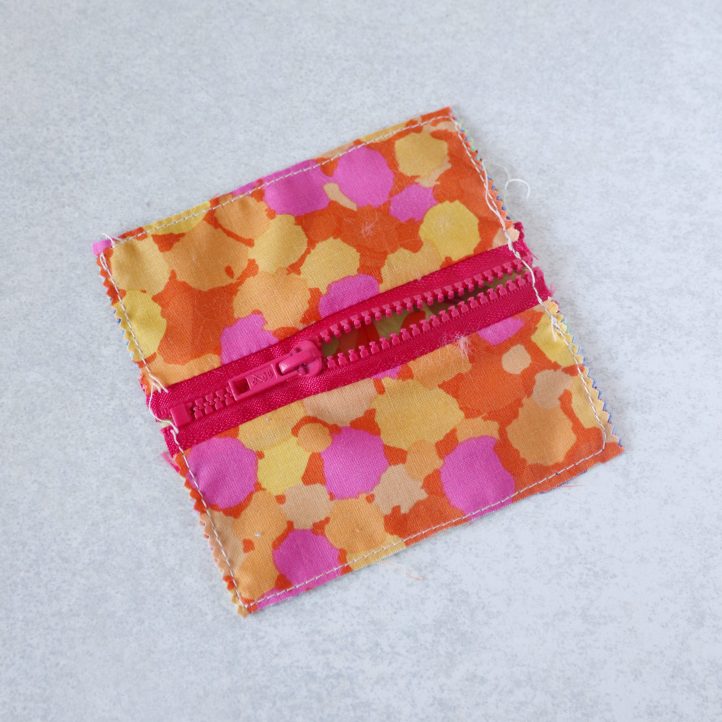 5. Make a zipper square. Take one of your charm pack pieces and cut it in half. With right sides facing, stitch each half along the long edges of a zipper to secure it down the center of the square. Trim the square down so it measures exactly 5 inches again. Place this zippered square on top of another charm pack piece with the right sides up and the edges aligned, then baste around the edge to hold the layers together.