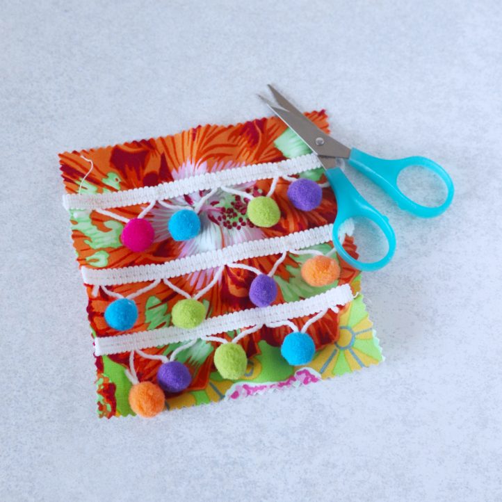 7. Next, make two pom pom squares. Pin several lengths of pom pom trim across a charm pack piece and machine top stitch along the length of the trim to hold it in place. Repeat to make another pom pom square – we created one with vertical stripes, and one with horizontal stripes.