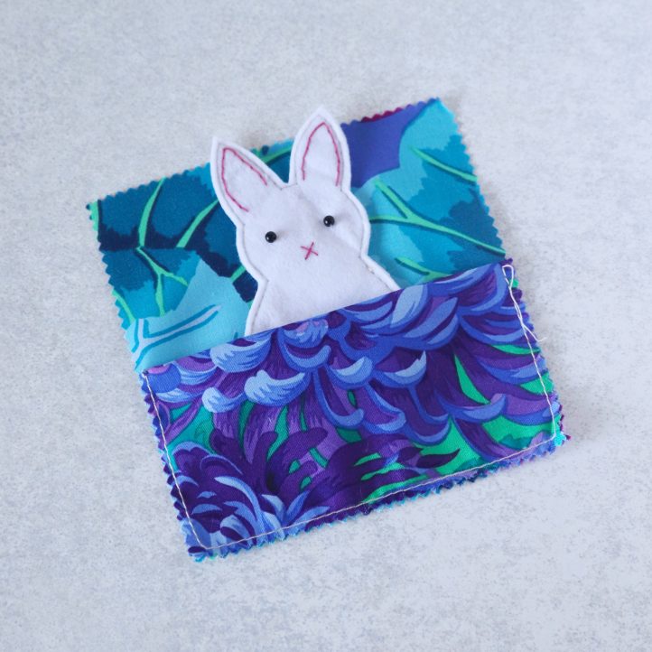 8. Now for one of our favorite squares – featuring a cute bunny in a pocket! Print the PDF template and use it to cut two rabbit shapes from white felt. Embroider ears and a mouth onto one piece using two strands of pink embroidery floss, then stitch two seed beads on for eyes. Layer the two felt pieces together with the right sides out and the edges aligned, then machine stitch all around the edge to join them. Take a 5-inch charm pack piece, then fold it in half with the right sides facing out and press. Place the folded piece on top of a matching-colored fabric square, aligning the bottom and side edges and with the fold aligned in the middle. Baste the layers together – this forms your rabbit’s pocket.